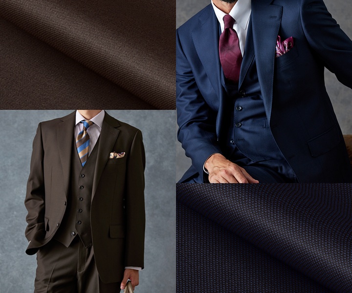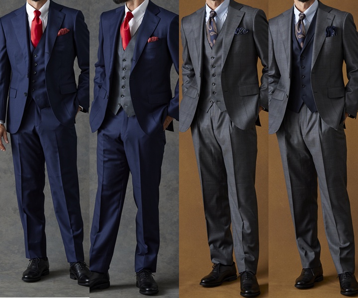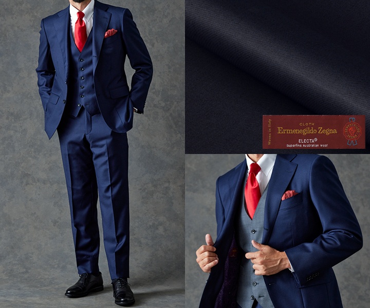 艶・質感・着心地すべてが一級品の世界最高峰の生地メーカー。クロスゼニアからは秋冬定番コレクション「エレクタ」のネイビーをチョイス。上図のようにベストを変えるだけでセレモニーシーンにも活躍します。