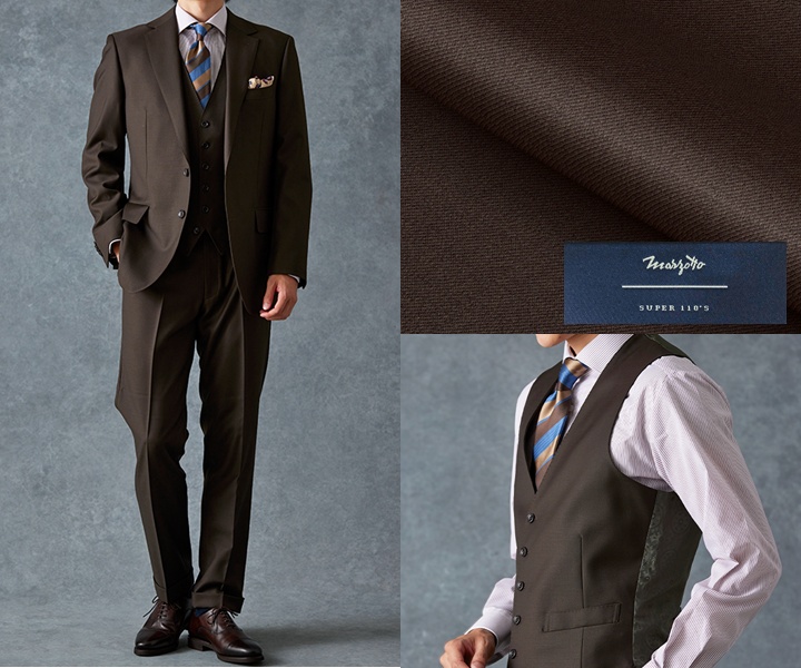 軽さと柔らかさ、そして発色の美しさに定評のあるイタリアを代表する老舗生地メーカー。マルゾットからはブラウン無地をチョイス。しっとりとした質感と落ち着いた色合いで、スリーピーススーツの持つ“包容力”や“大人の余裕”を一層引き立ててくれます。