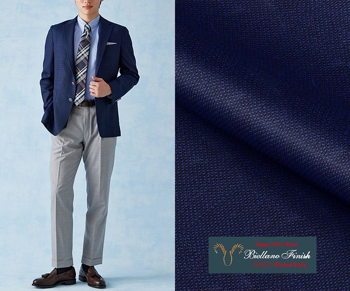 『ビエラーノフィニッシュ』のネイビージャケットは、落ち着いた織り柄が入ったスタイルで、程よい光沢の入った生地です。チェック柄のネクタイを取り入れることで、堅くなりすぎずカジュアルな印象を与えるコーデです。