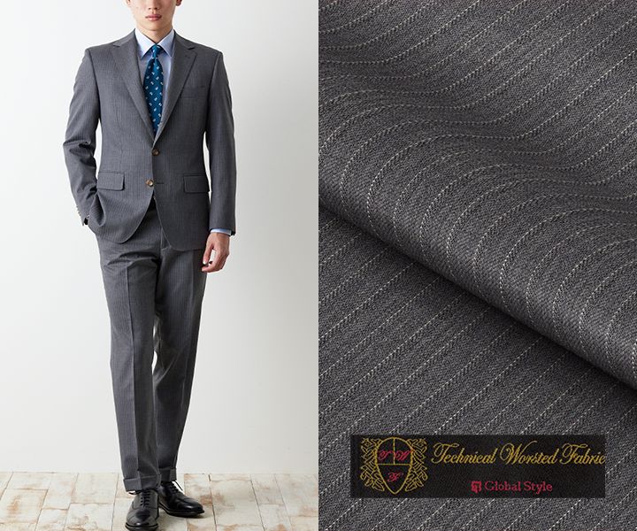 『テクニカル・ウーステッド』のグレースーツは、幅の狭いストライプを組み合わせたスタイルで、防シワ性や通気性に優れた生地です。サックスのシャツとライトブルーのネクタイを合わせた、爽やかなコーデです。