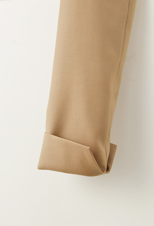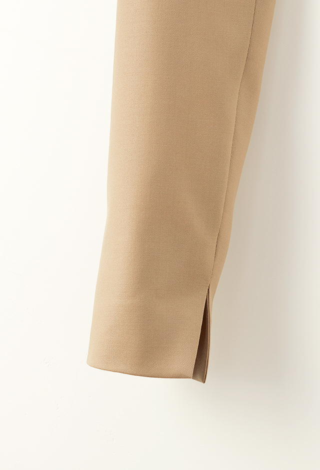 イタリアブランド「カノニコ」の生地は、軽くて、柔らかく、発色の良さが大きな特徴です。滑らかな生地の質感が印象的なベージュカラーと無地のスタイルで、春夏シーズンの生地になります。スカーフは、イエロー・オレンジ等の暖色カラーを合わせることで、全体をパッと明るい印象に仕上げてくれます。ジャケットのポケットは斜めにすることでシャープな印象に。スタイルアップ効果の高いセミフレアタイプのボトムスにすることで、洗練された雰囲気を纏ったコーデです。※生地在庫は変動いたしますのでご了承くださいませ。