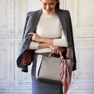 「ルイージ・コロンボ」で仕立てたスーツ。Colombo社の素材は全世界のエグゼクティブから絶大なる支持を集めています。ライトグレーにピンクカラーのチェック柄が入ったスタイルで、ビジネスシーン、プライベート用としてもお使いいただけます。定番のテーラードジャケットをよりスタイリッシュにアレンジしたモデル、ボトムスは定番のスカートで仕立てました。裏地には、サーモンピンクをチョイスして優しい雰囲気に。さり気なくピンクのチェック柄とスカーフのカラーを合わせたコーデです。※生地在庫は変動いたしますのでご了承くださいませ。