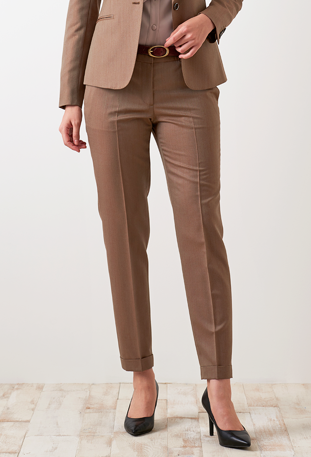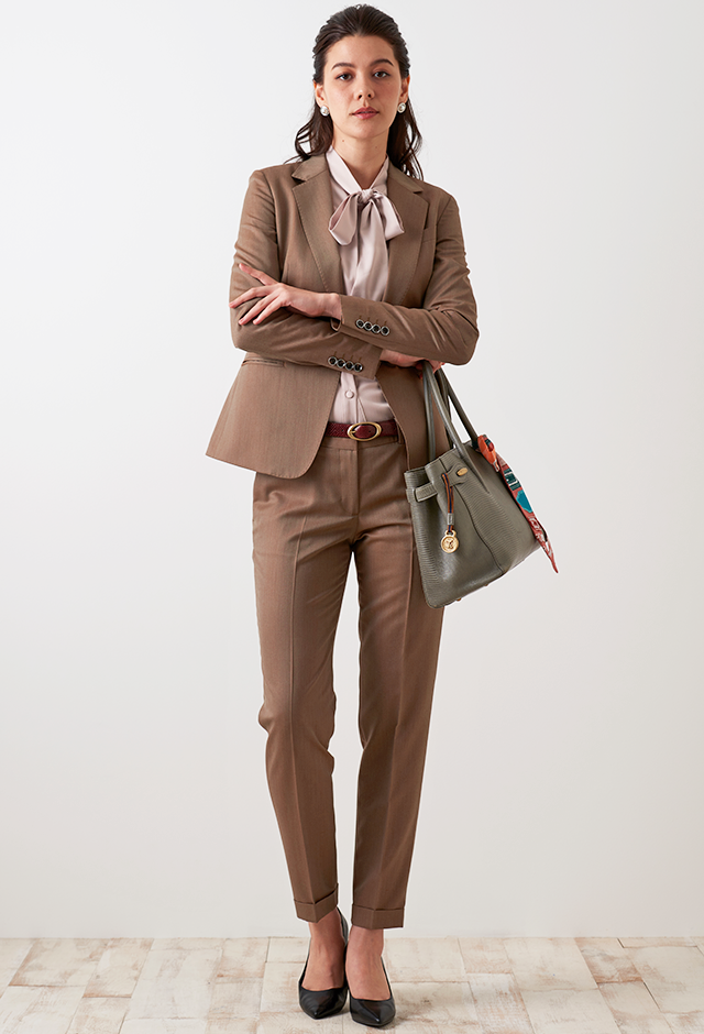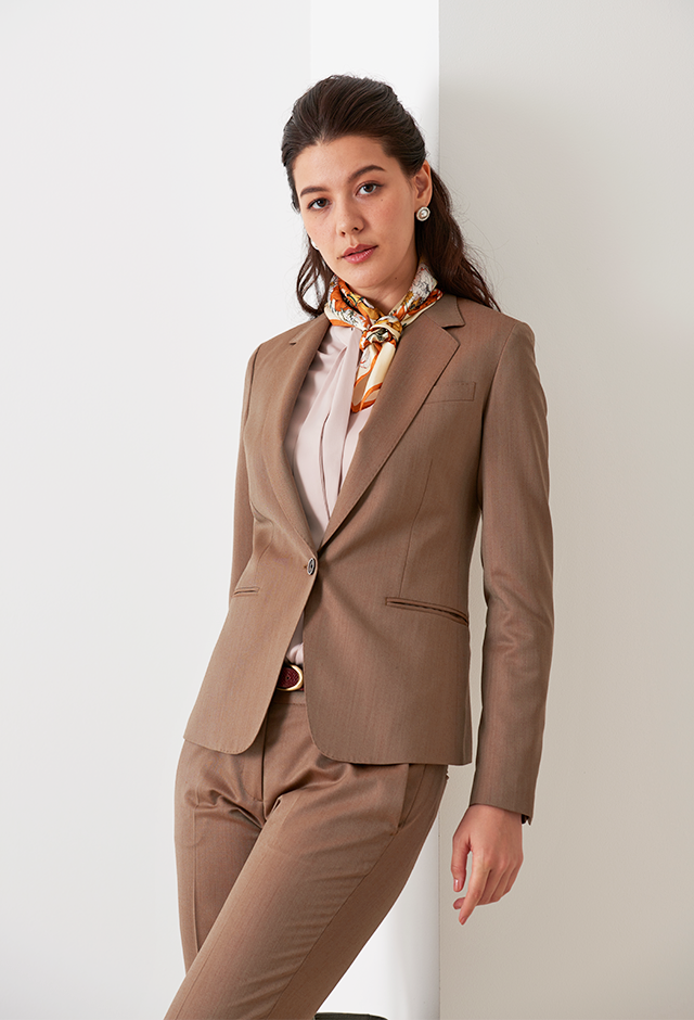 オーダースーツ専門店GlobalStyleで取り扱っている「ベージュスーツ・無地のコーディネート(Savile Clifford)|16414-8X7|スタイルブック(レディース)」の紹介ページです。本格オーダースーツが1着2万円台~!約5,000種類の生地をリーズナブルな価格でご用意しております。