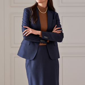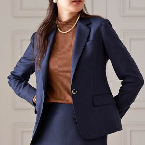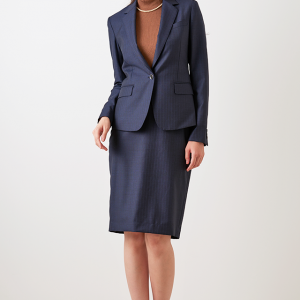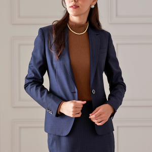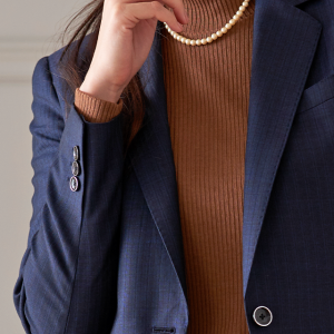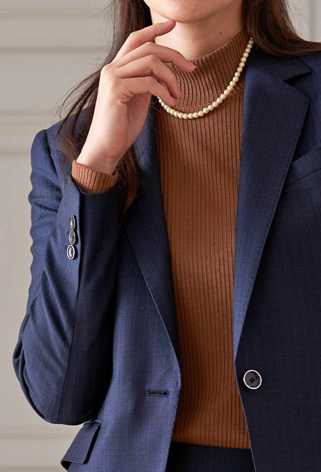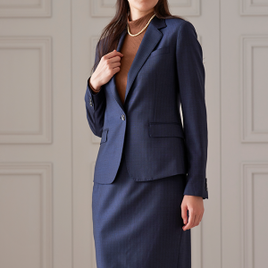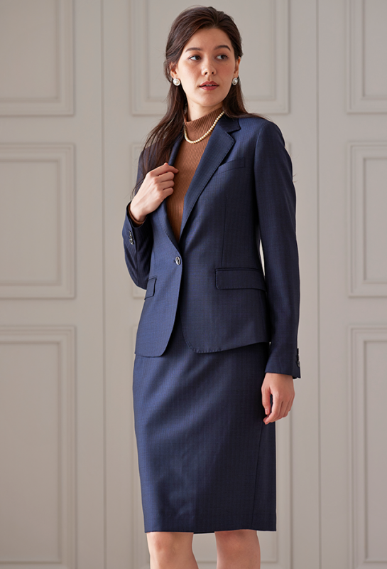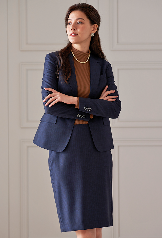 高品質でコストパフォーマンスに優れたイタリアブランド「カノニコ」で仕立てたスーツです。人気のネイビーカラーに、シャドーストライプを組み合わせたスタイルで、オールシーズン着用していただけます。ジャケットはテーラーギビングモデル(1つボタン)、ボトムスは定番のスカートで仕立てました。ジャケットオプションにはAMF(手縫い風のステッチ)でアクセントを入れました。ブラウンのインナーと合わせて、知的な雰囲気に仕上げたコーデです。※生地在庫は変動いたしますのでご了承くださいませ。