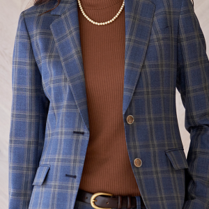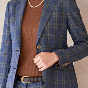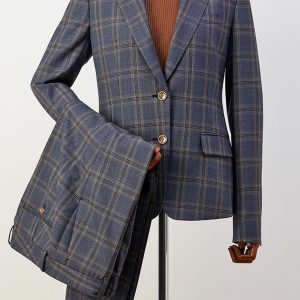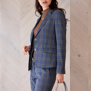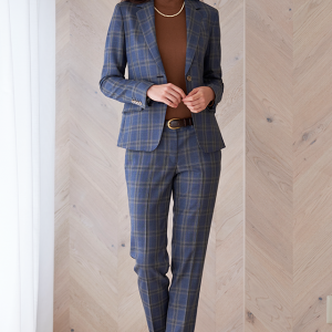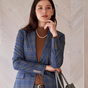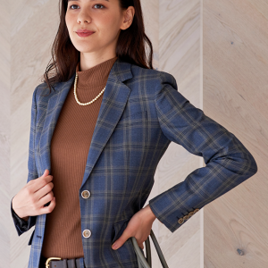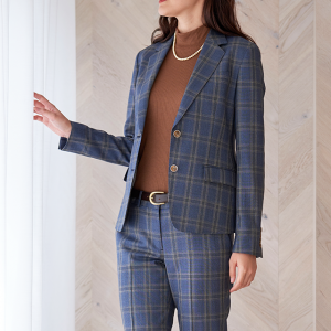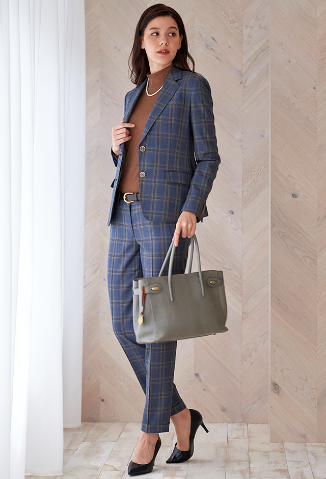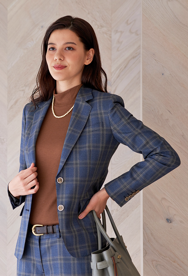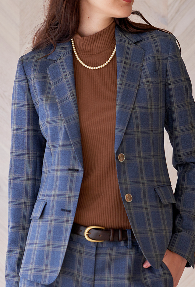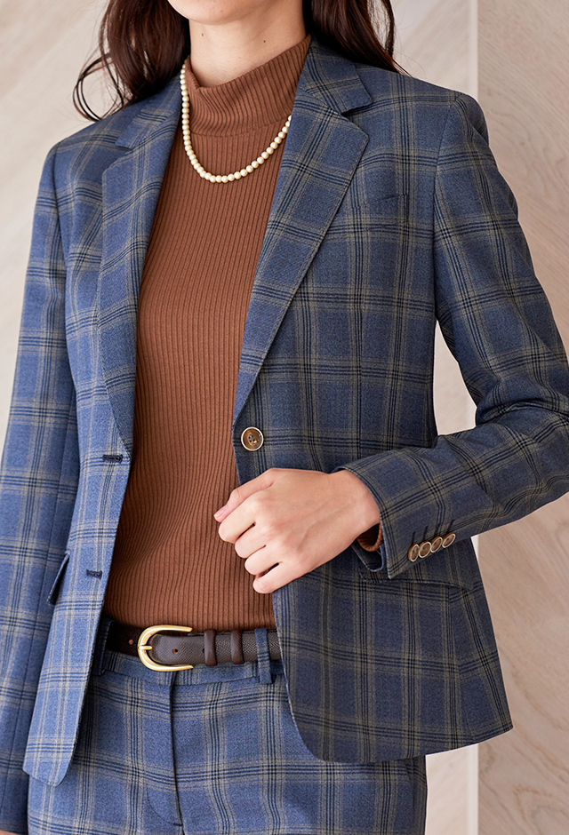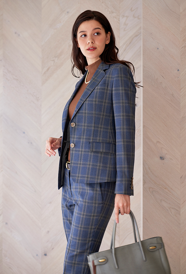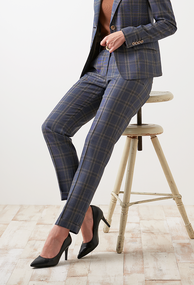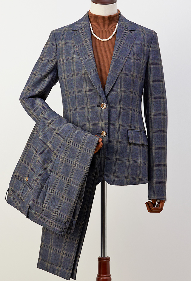 オーダースーツ専門店GlobalStyleで取り扱っている「ブルーグレースーツ・チェックのコーディネート(CANONICO)|27-162-1|スタイルブック(レディース)」の紹介ページです。本格オーダースーツが1着2万円台~!約5,000種類の生地をリーズナブルな価格でご用意しております。