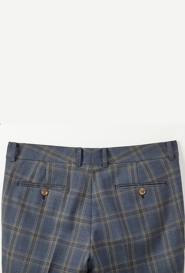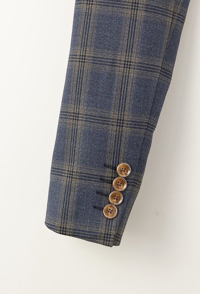 高品質でコストパフォーマンスに優れたイタリアブランド「カノニコ」で仕立てたスーツです。ブルー系のグレーカラーに、イエローのチェック柄が入ったお洒落なスタイルで、秋冬シーズンの生地になります。ジャケットはテーラーギビングモデル(2つボタン)、ボトムスは人気のテーパードパンツで仕立てました。パンツの裾は、カジュアルな印象ながらビジネスシーンにも使えるダブルタイプ。グレー、ブラウン、イエローのコントラストが美しいコーデです。※生地在庫は変動いたしますのでご了承くださいませ。
