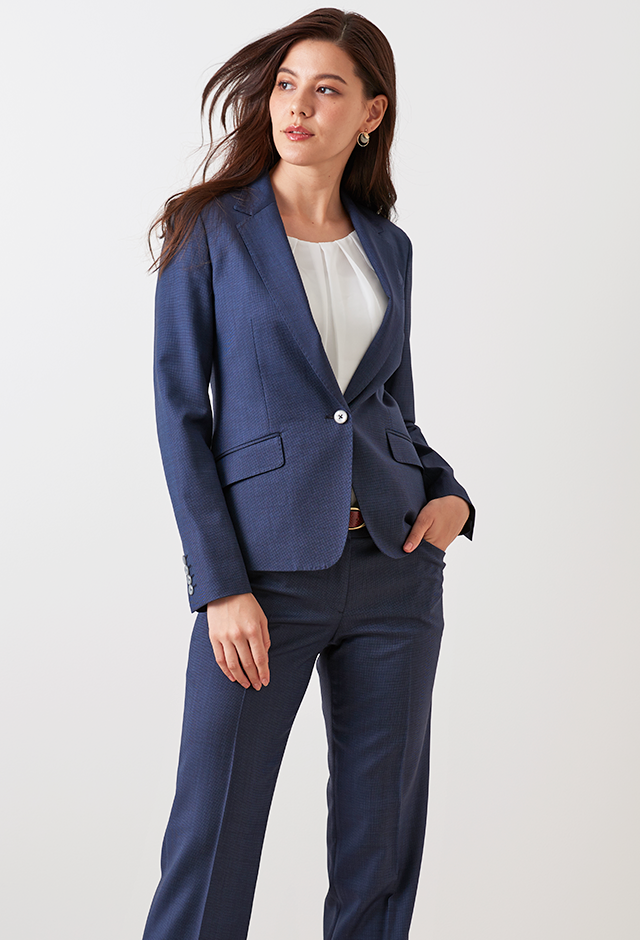 ストレッチ性の高い生地が大好評のイタリアブランド「トラバルド・トーニャ」で仕立てたスーツです。ブルー系ネイビーカラーに繊細な織り模様が美しい無地のスタイルで、オールシーズン着用していただけます。ジャケットはテーラーギビングモデル(1つボタン)、ボトムスはクールなセミフレアパンツで仕立てました。ジャケットの裏側は、センターに切れ込みがあるセンターベントタイプで動きやすい仕様に。ライトトーンの小物やパンプスを組み合わせた爽やかなコーデです。※生地在庫は変動いたしますのでご了承くださいませ。