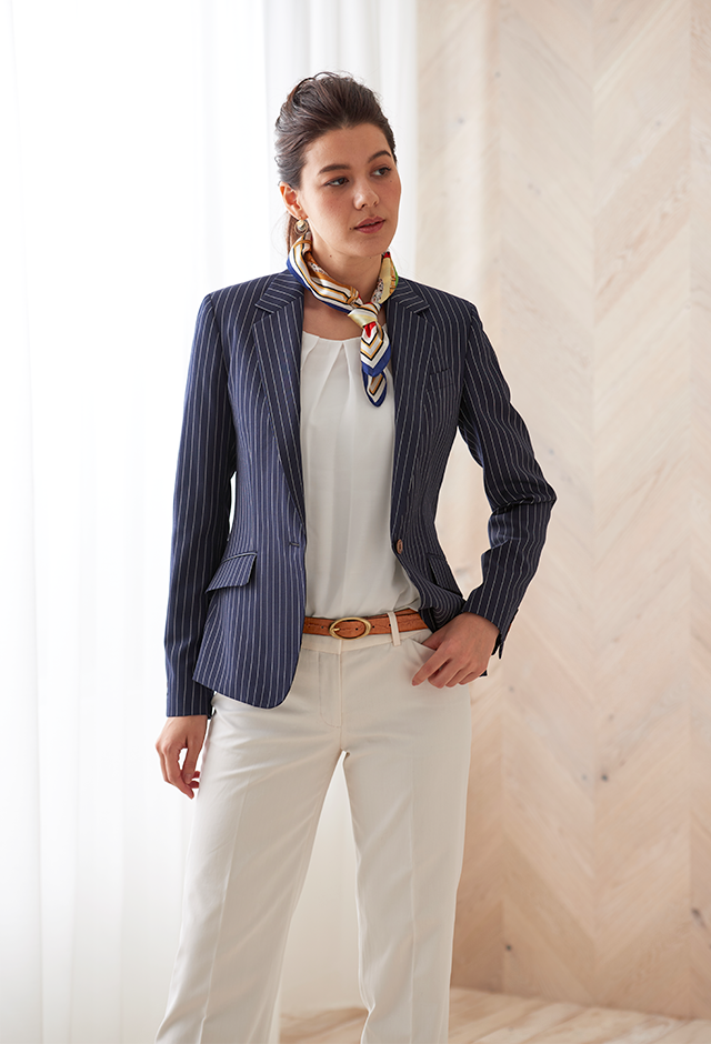 ストレッチ性の高い生地が大好評のイタリアブランド「トラバルド・トーニャ」で仕立てたスーツです。ネイビーカラーに白のストライプ柄を組み合わせたスタイルで、ビジネスシーン、プライベート用としてもお使いいただけます。ジャケットはテーラーギビングモデル(1つボタン)、ボトムスはクールなセミフレアパンツで仕立てました。パンツのポケットは浅めのLポケットでスマートな印象に。タックインスタイルも映えます。カラフルなスカーフをあしらった、オンだけでなくオフでも映えるコーデです。※生地在庫は変動いたしますのでご了承くださいませ。