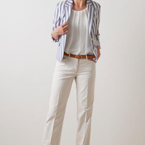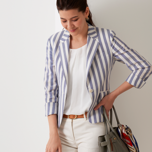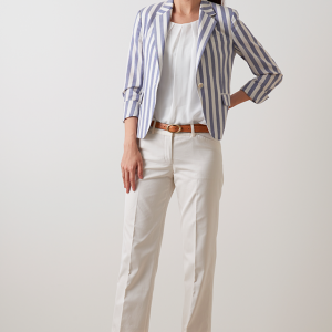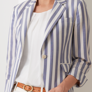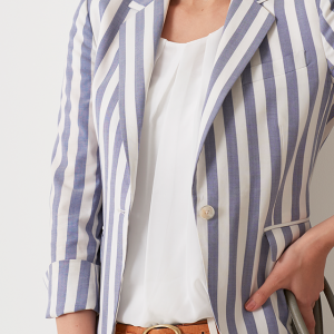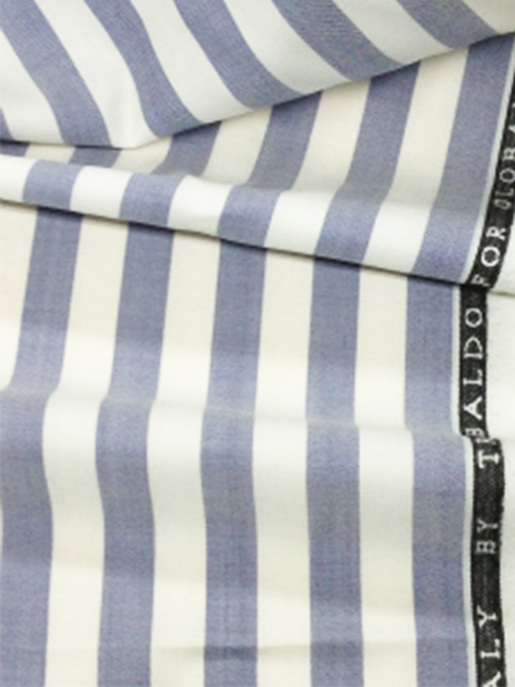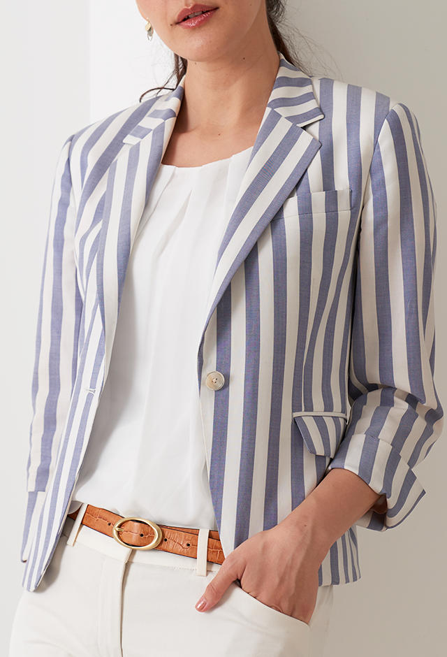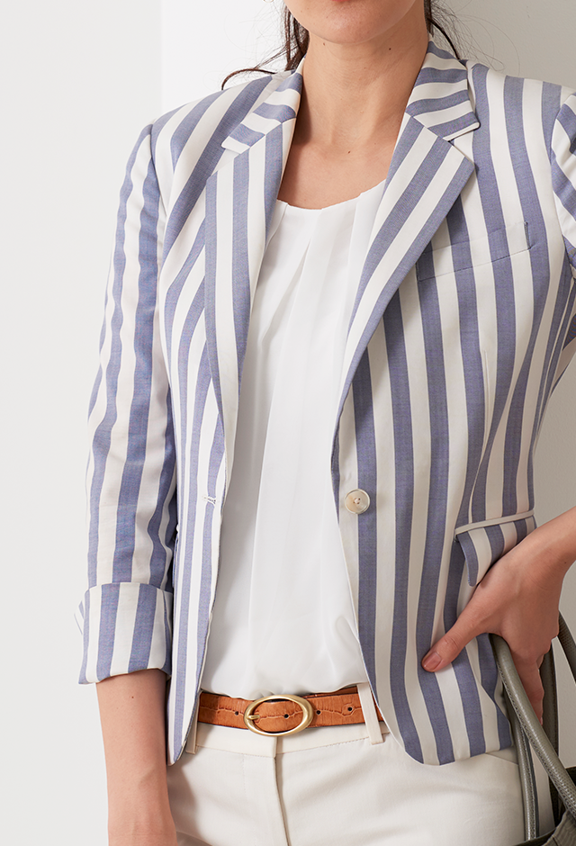 ストレッチ性の高い生地が大好評のイタリアブランド「トラバルド・トーニャ」で仕立てたスーツです。明るいトーンのブルー×白の太ストライプ柄のスタイルで、春夏シーズンの生地になります。ジャケットはテーラーギビングモデル(1つボタン)、ボトムスはクールなセミフレアパンツで仕立てました。ジャケット袖はスリット(切り込みが入った仕様)で、袖を折り返すスタイルもおすすめです。白を基調とした清涼感のあるコーデで、オンだけでなくオフでも映えるコーデです。※生地在庫は変動いたしますのでご了承くださいませ。