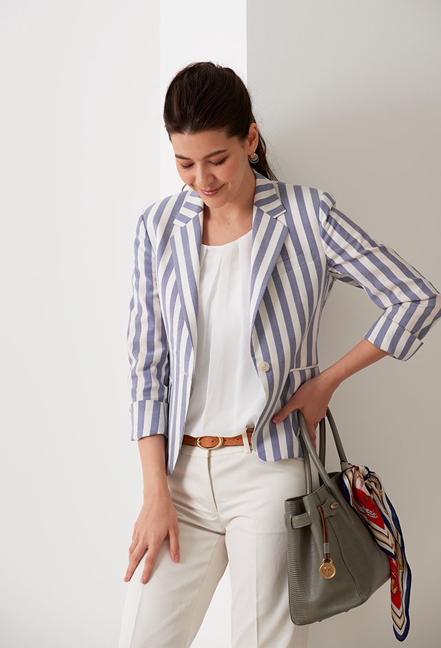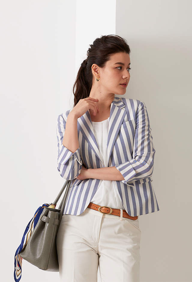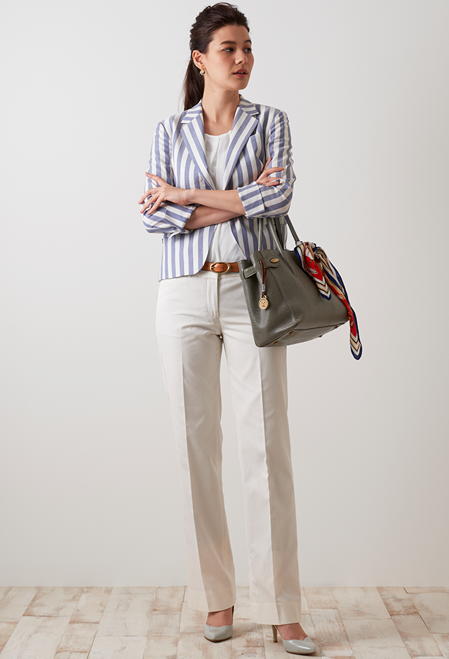 オーダースーツ専門店GlobalStyleで取り扱っている「その他スーツ・ストライプのコーディネート(TRABALDO TOGNA)|11479F-30-3|スタイルブック(レディース)」の紹介ページです。本格オーダースーツが1着2万円台~!約5,000種類の生地をリーズナブルな価格でご用意しております。