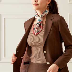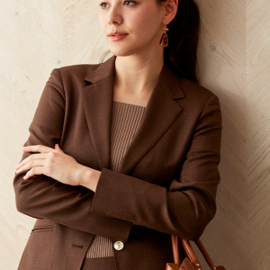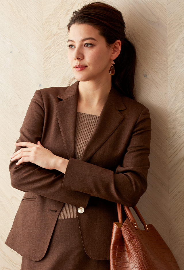 ファッション性が高くお洒落な生地が豊富な「アリストン」で仕立てたスーツです。トレンドのブラウンカラーに滑らかな生地の質感が印象的なスタイルで、オールシーズン着用していただけます。ジャケットはテーラーギビングモデル(2つボタン)、ボトムスは定番のスカートで仕立てました。見る角度で輝きの変わる美しい貝ボタン。裏地にはブラウンと相性の良いピンクカラーをチョイス。ピンクカラーのスカーフを差し色に、ブラウンでまとめて統一感を出したコーデです。※生地在庫は変動いたしますのでご了承くださいませ。
