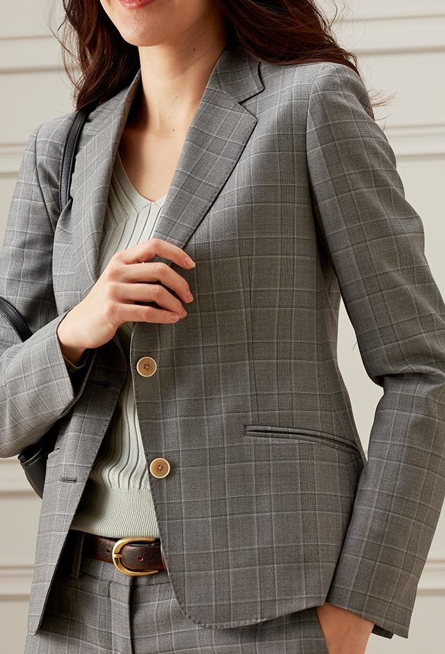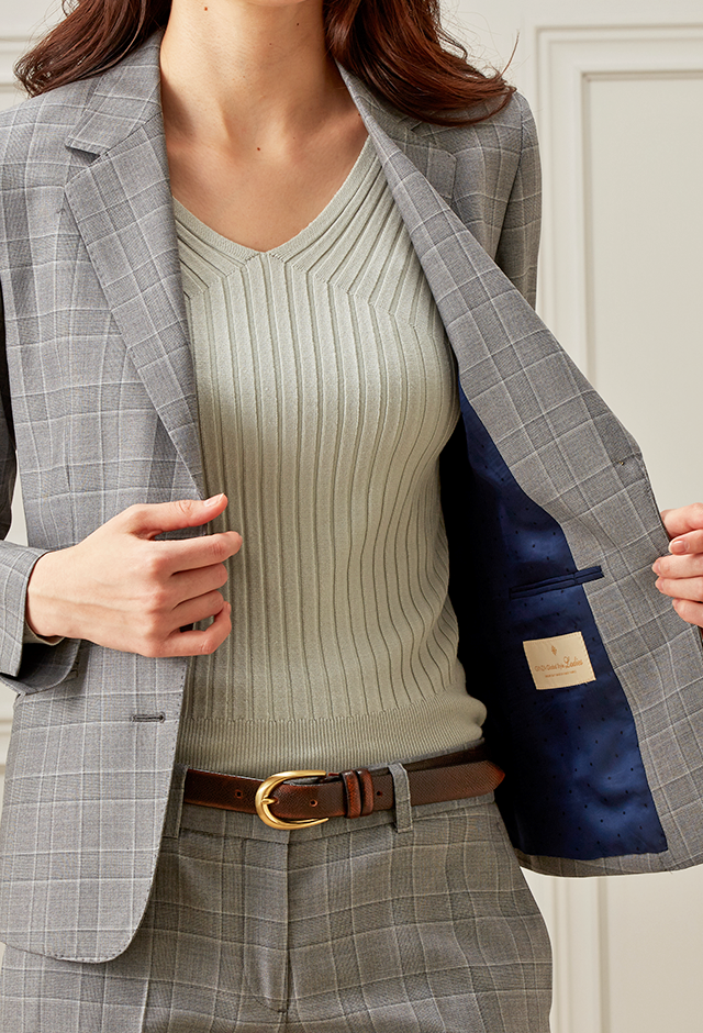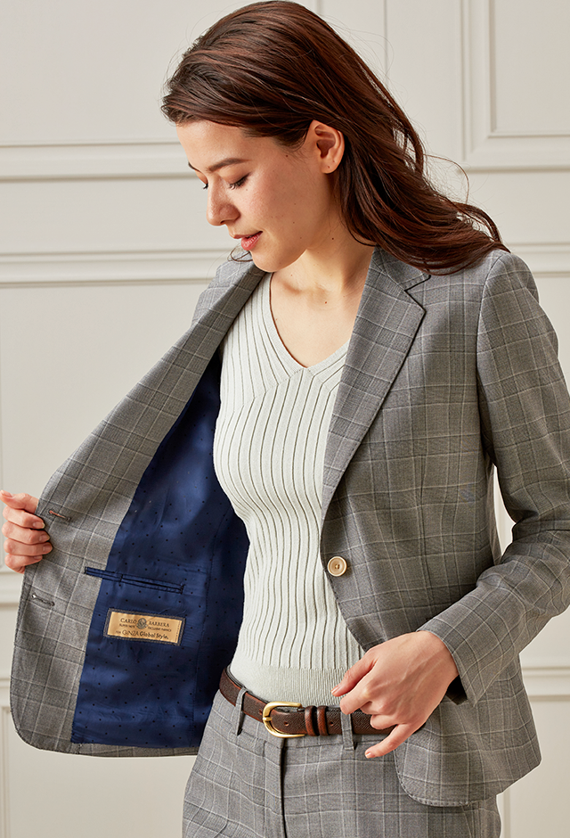 美しい生地を作り出す独自の製法を持つ「カルロ・バルべラ」で仕立てたスーツです。ライトグレー×同系色のチェック柄でビジネスシーンにも最適なスタイルで、オールシーズン着用していただけます。ジャケットはテーラーギビングモデル(2つボタン)、ボトムスはクールなセミフレアパンツで仕立てました。ネイビーにドット柄の入ったお洒落な裏地。ジャケットのポケットは斜めにすることでシャープな印象に。グリーン、ブラック、グレーのバランスが良い3色コーデです。※生地在庫は変動いたしますのでご了承くださいませ。