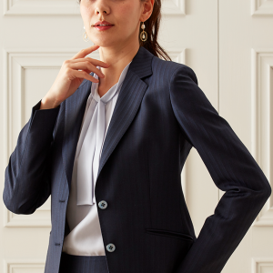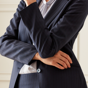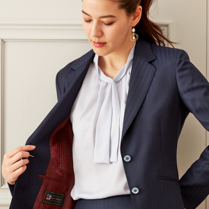 英国的な生地を作りだす知る人ぞ知る高級ブランド「サヴィル・クリフォード」で仕立てたスーツです。ネイビーにシャドーストライプ柄を組み合わせスタイルで、オールシーズン着用していただけます。ジャケットはテーラーギビングモデル(2つボタン)、ボトムスは定番のスカートで仕立てました。千鳥格子柄の艶やかな裏地はワインレッドカラー、ジャケットのポケットはフラップ無しですっきりと。定番ネイビーとブラック系の小物でビジネスシーンにも最適なコーデです。※生地在庫は変動いたしますのでご了承くださいませ。