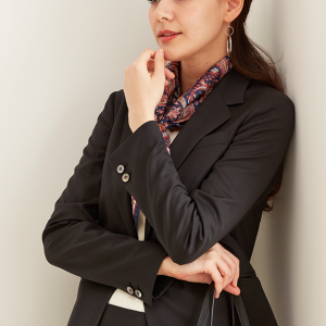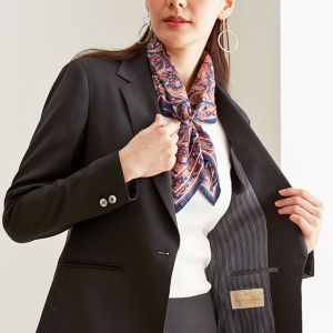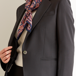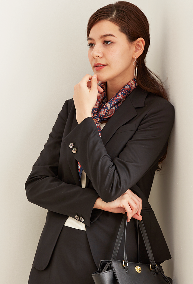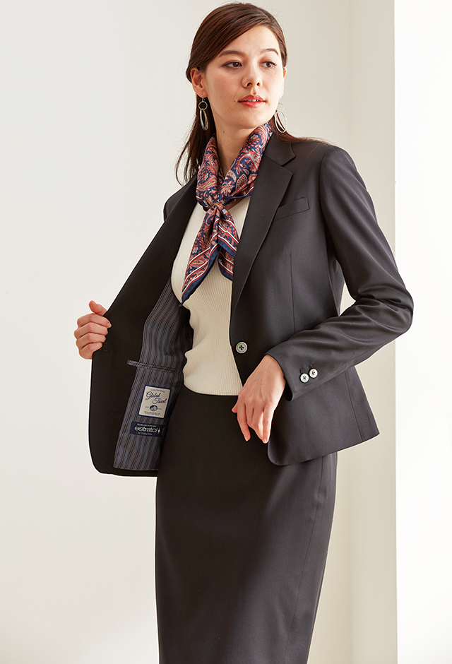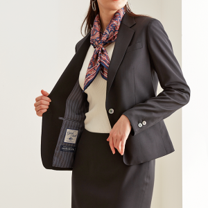 ストレッチ性の高い生地が大好評のイタリアブランド「トラバルド・トーニャ」で仕立てたスーツです。深みのあるブラックカラーに艶感の美しい生地が映える無地スタイルで、オールシーズン着用していただけます。ジャケットはテーラーギビングモデル(1つボタン)、ボトムスは定番のスカートで仕立てました。グレーのストライプ柄裏地でさり気ないお洒落を。ジャケットのポケットはフラップ無しですっきりと。フォーマルなシーンは勿論、スカーフをプラスすれば華やかなコーデになります。※生地在庫は変動いたしますのでご了承くださいませ。