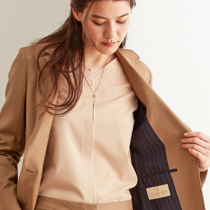 80ケ国以上にファンを持つ世界的なイギリスブランド「ドーメル」で仕立てたスーツです。トレンドのベージュカラーに滑らか生地の質感が印象的なスタイルで、オールシーズン着用していただけます。ジャケットはテーラーギビングモデル(1つボタン)、ボトムスはクールなセミフレアパンツで仕立てました。裏地はお洒落なストライプ柄をチョイス。ジャケット袖はスリット(切り込みが入った仕様)ですっきりと。シンプルにまとめることで、スーツの絶妙なベージュカラーが際立つコーデです。※生地在庫は変動いたしますのでご了承くださいませ。