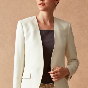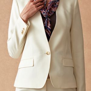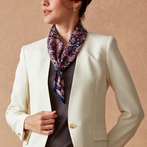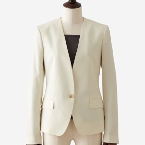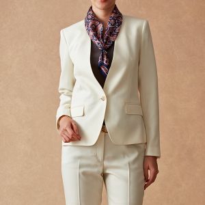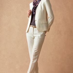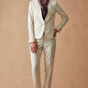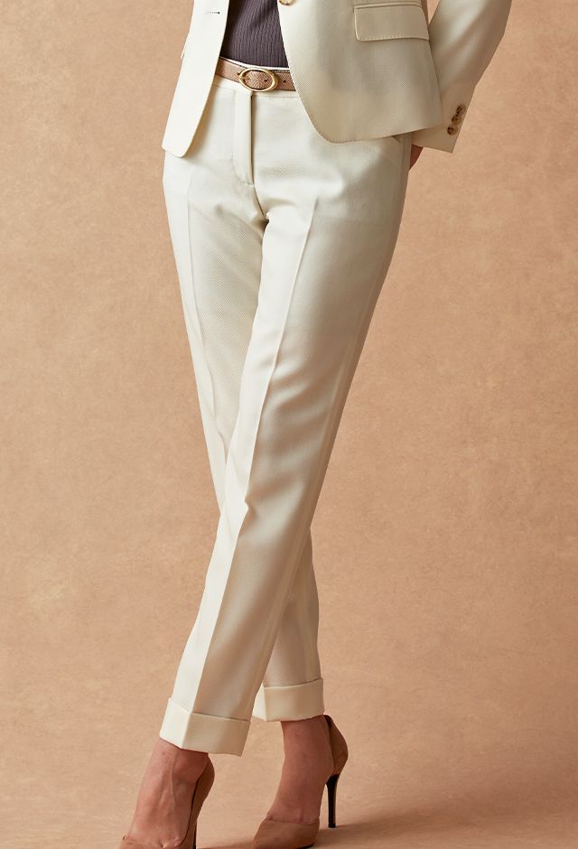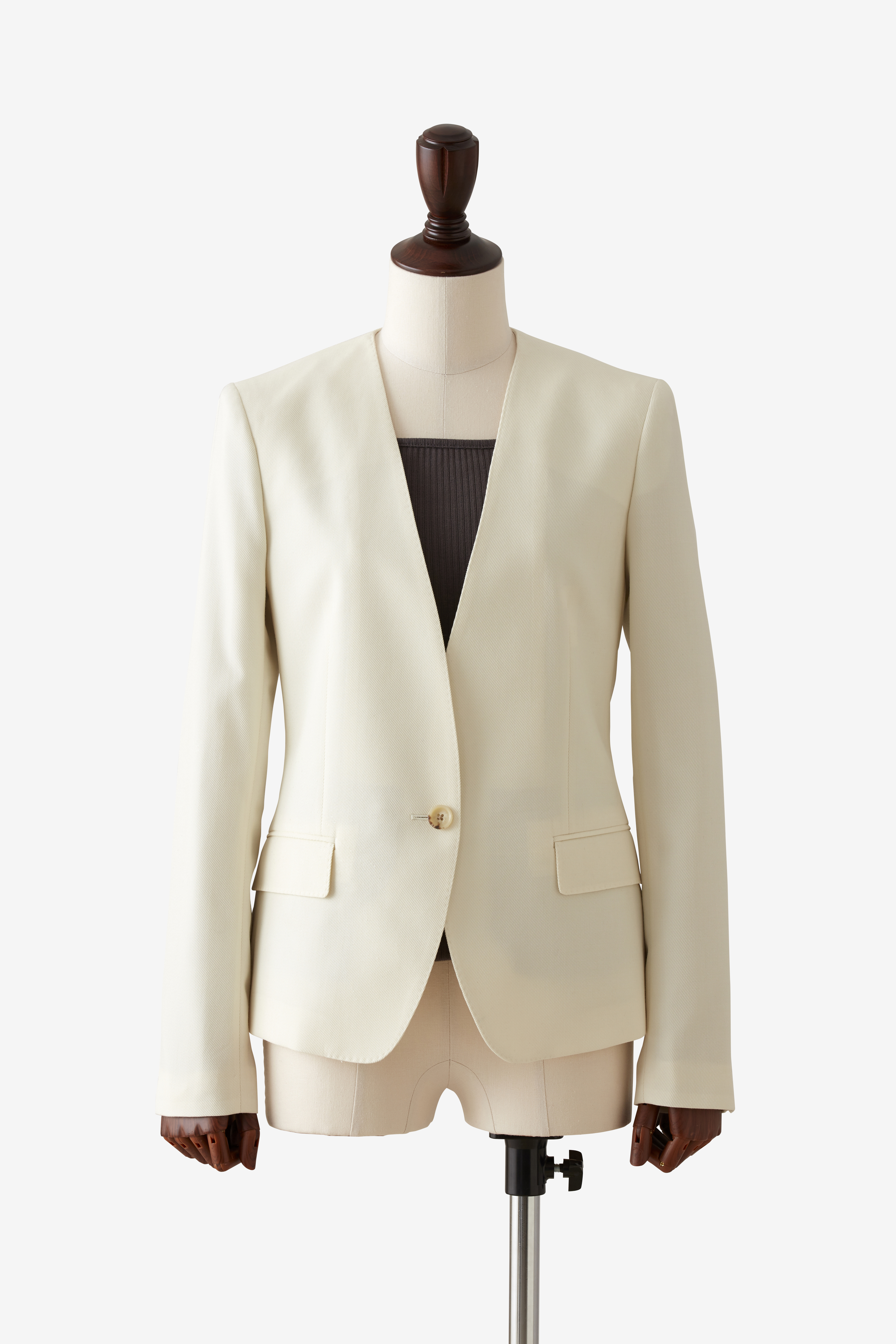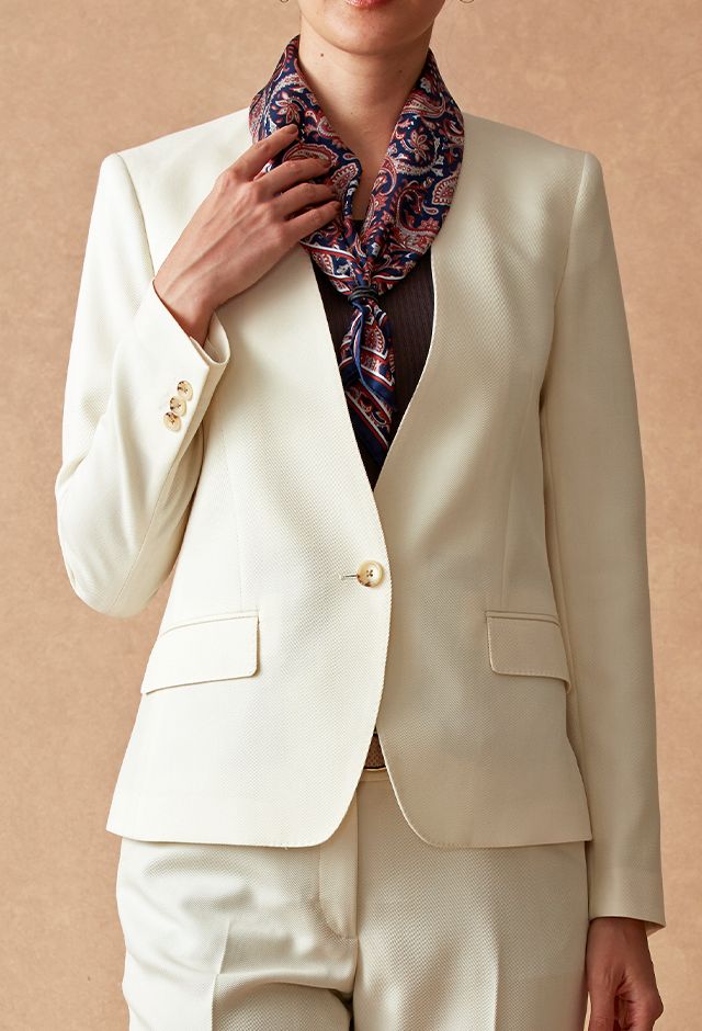 雨が多く多湿な気候を有する市場においても絶大な評価を獲得している「ドラゴ」で仕立てたスーツです。無地だからこそより映えるホワイトカラーのスタイルで、オールシーズン着用していただけます。ジャケットはノーカラーモデル(ボタン)、ボトムスは人気のテーパードパンツで仕立てました。パンツの裾は、カジュアルな印象ながらビジネスシーンにも使えるダブルタイプ。スカーフやアッシュカラーのインナーと組み合わせた気品溢れるコーデです。※生地在庫は変動いたしますのでご了承くださいませ。