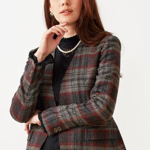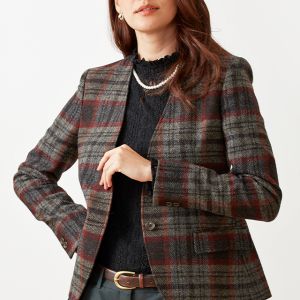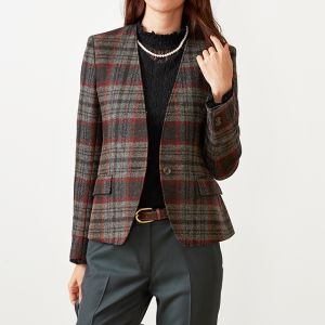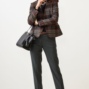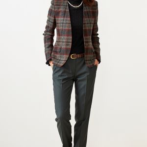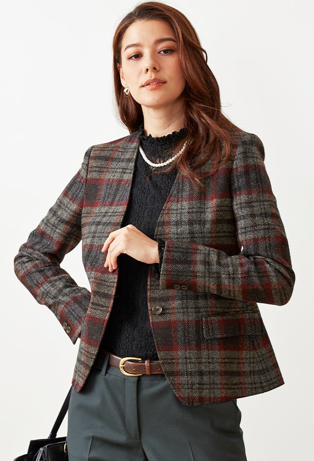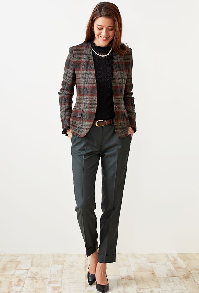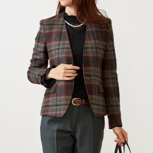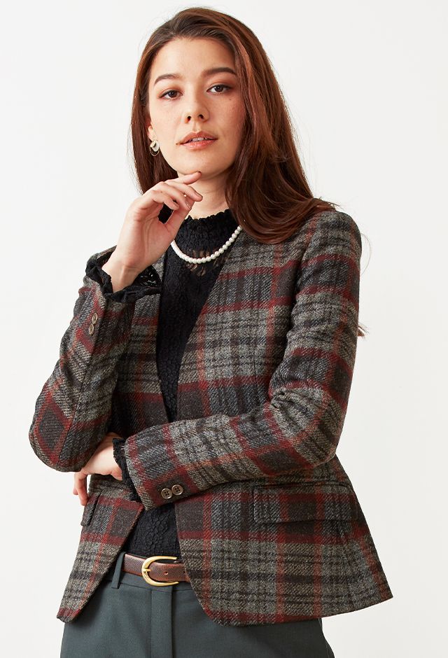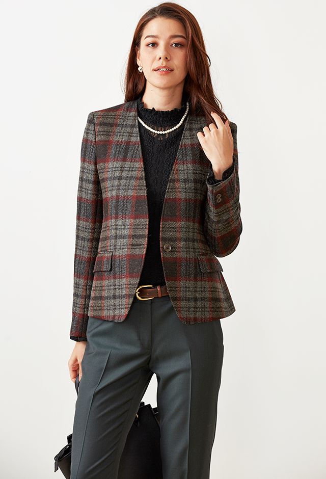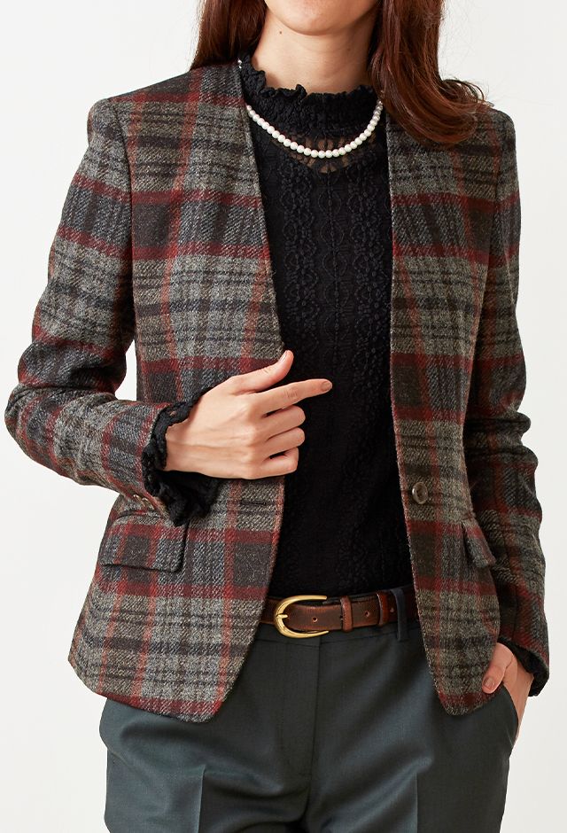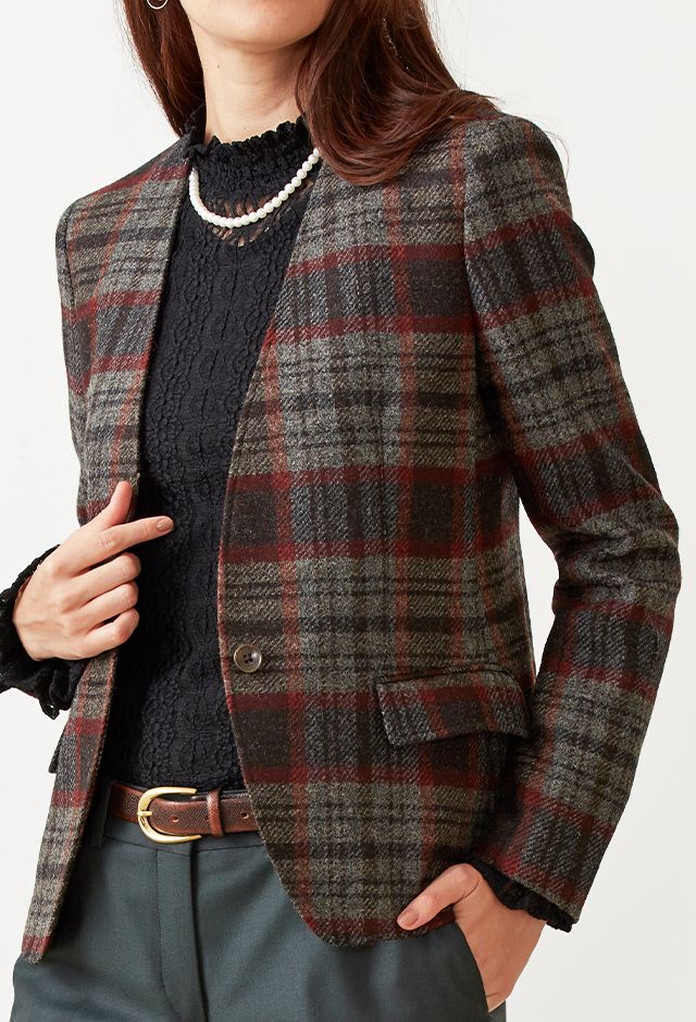 ファッション性の高い織柄と絶妙な色合いを醸し出す糸使いの生地が魅力の英国ブランド「ムーン」で仕立てたジャケットです。グレーカラーのベースに赤やオレンジ等が入ったのお洒落なチェック柄スタイルで、秋冬シーズンの生地になります。ジャケットはノーカラーモデル(ボタン)、ボトムスは人気のテーパードパンツで仕立てました。ジャケットにはミシンステッチを入れてステッチを強調。ボトムスにカーキを取り入れ、多彩なカラーをバランス良くまとめたコーデです。※生地在庫は変動いたしますのでご了承くださいませ。
