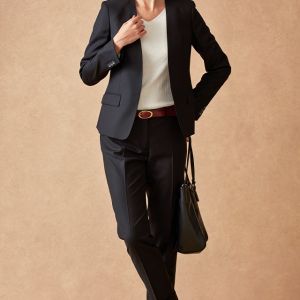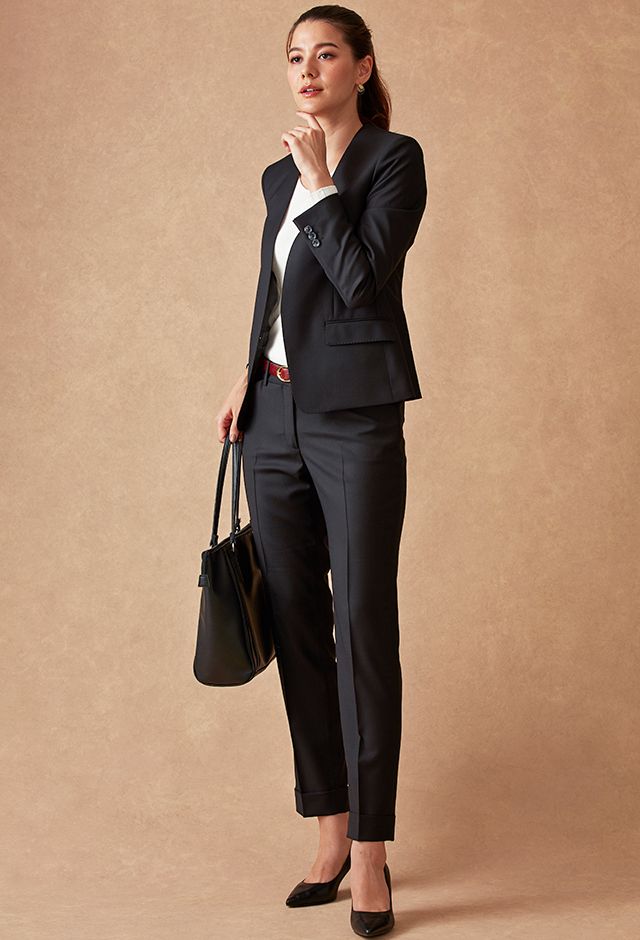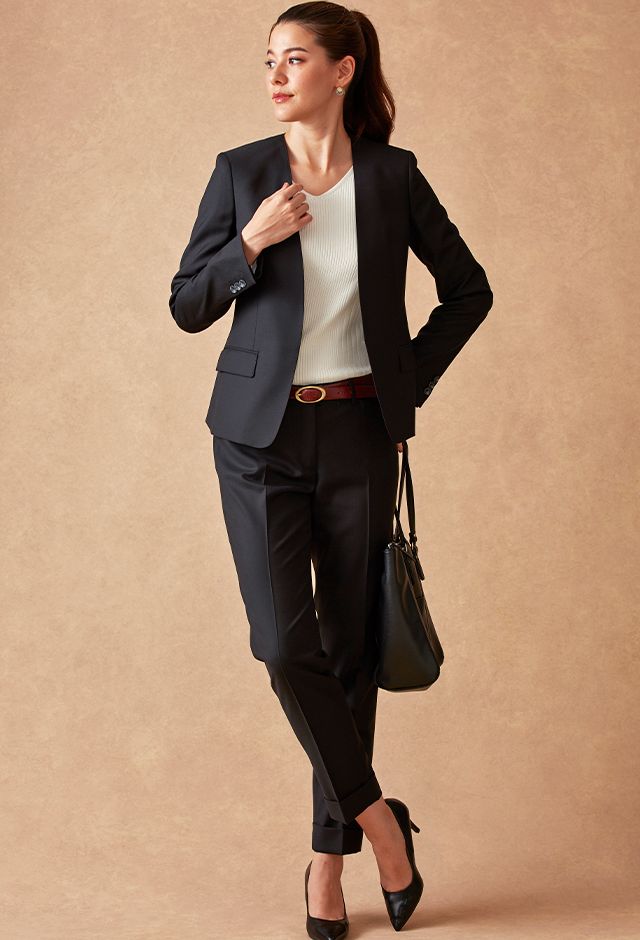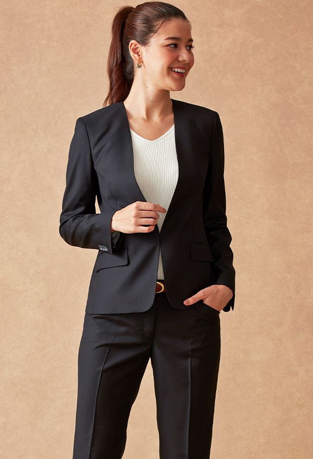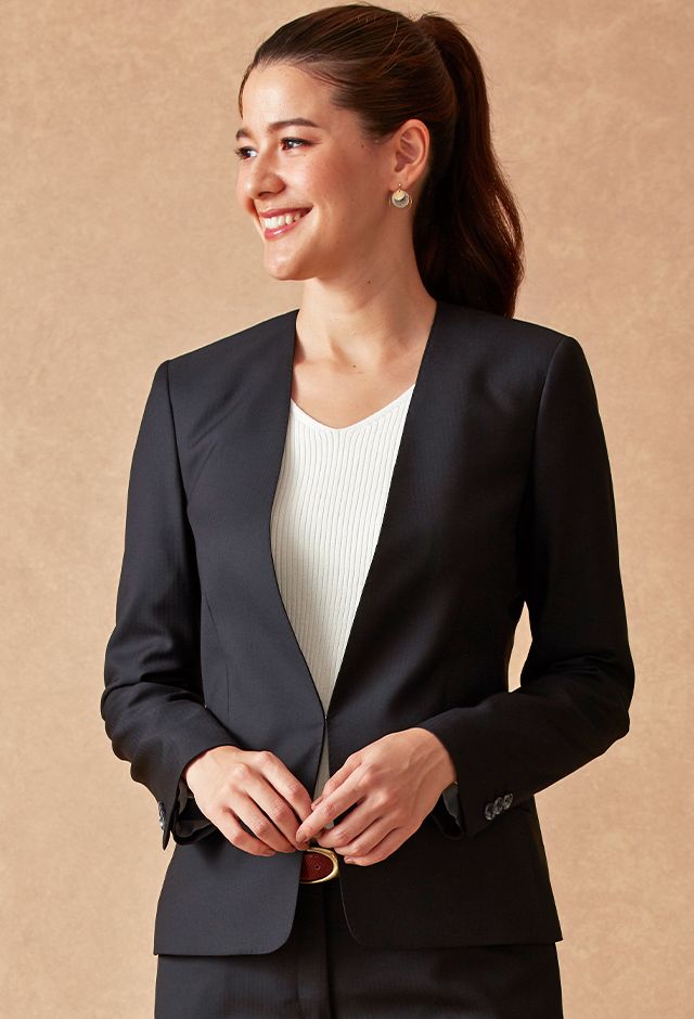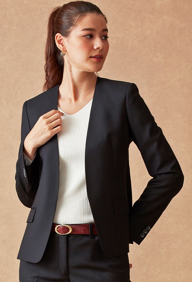 ストレッチ性の高い生地が大好評のイタリアブランド「トラバルド・トーニャ」で仕立てたスーツです。ブラックカラーに大人の雰囲気のヘリンボーンストライプ柄が入ったスタイルで、オールシーズン着用していただけます。ジャケットはノーカラーモデル(ホック)、ボトムスは人気のテーパードパンツで仕立てました。パンツのポケットは浅めのLポケットでスマートな印象に。タックインスタイルも映えます。白のインナーと組み合わせた、ビジネスシーンにも最適なコーデです。※生地在庫は変動いたしますのでご了承くださいませ。