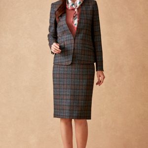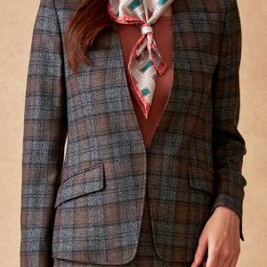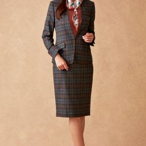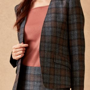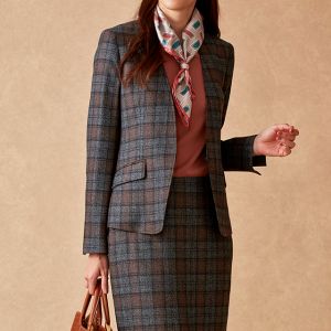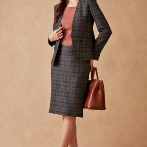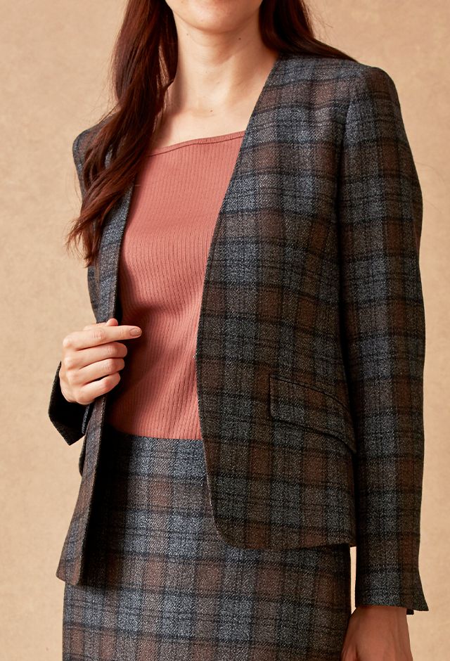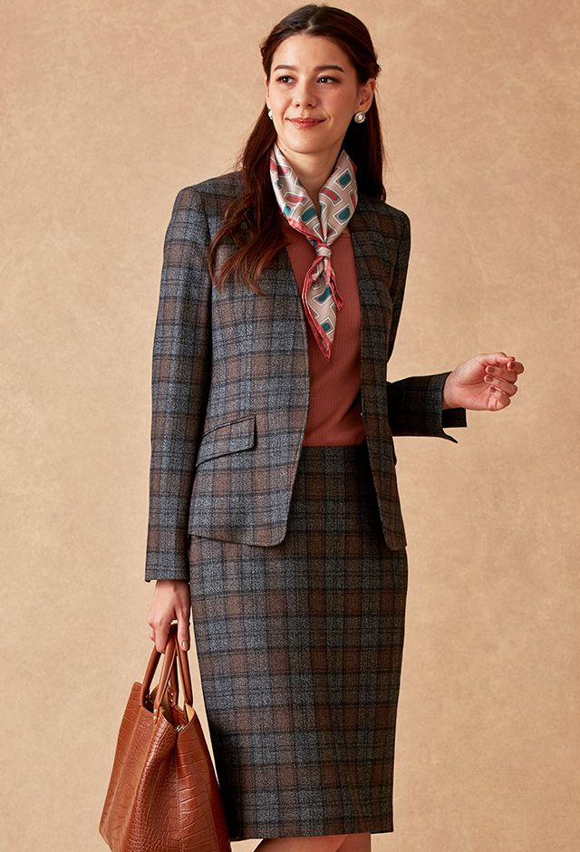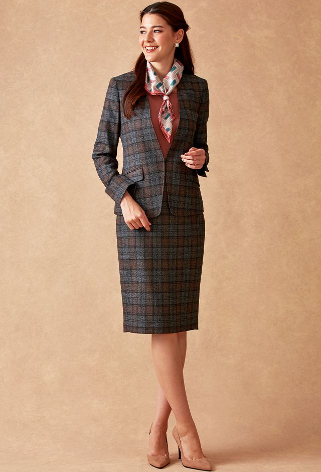 世界中のセレブリティから支持を得ているラグジュアリーブランド「ロロ・ピアーナ」で仕立てたスーツです。グレーにブラウンのチェックが入った優しい風合いのスタイルで、秋冬シーズンの生地になります。ジャケットはノーカラーモデル(ホック)、ボトムスは定番のスカートで仕立てました。ポケットは斜め(スラント)にすることでシャープな印象に仕上がります。コーラルピンクのインナーやスカーフでフェミニンな雰囲気に仕上げました。※生地在庫は変動いたしますのでご了承くださいませ。
