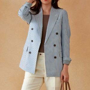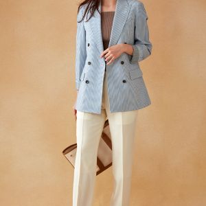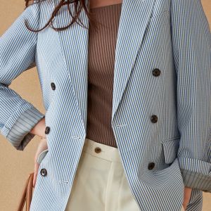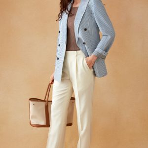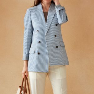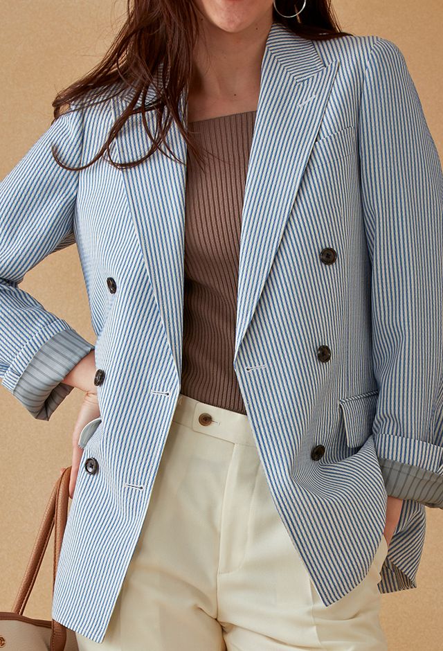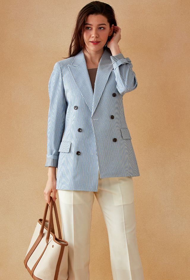 高品質でコストパフォーマンスに優れたイタリアブランド「カノニコ」で仕立てたスーツです。涼しげな質感のシアサッカーの生地に、爽やかなブルーストライプが入ったスタイルで、春夏シーズンの生地になります。肩パットや芯地を極力排したアンコンモデル(ダブル)でジャケットを仕立てました。ボタンにはブルーと相性の良いブラウンカラーをチョイス。白いボトムスと合わせた清潔感溢れるコーデです。※こちらはメンズのモデルでお仕立てしたスーツになります。※生地在庫は変動いたしますのでご了承くださいませ。