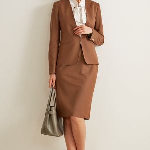 雨が多く多湿な気候を有する市場においても絶大な評価を獲得している「ドラゴ」で仕立てたスーツです。滑らかな質感の生地にトレンドのブラウンカラーのスタイルで、オールシーズン着用していただけます。ジャケットはノーカラーモデル(ホック)、ボトムスは定番のスカートで仕立てました。ジャケットにはミシンステッチを入れてステッチを強調。ポケットは斜めにすることでシャープな印象に。ブラウスと組み合わせて上品に仕上げたコーデです。※生地在庫は変動いたしますのでご了承くださいませ。