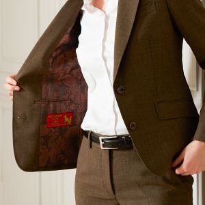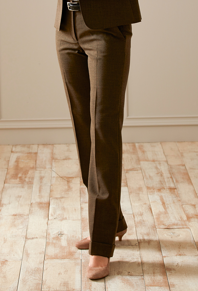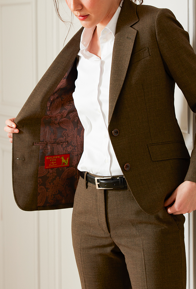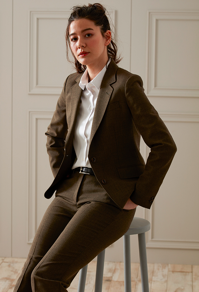 フランネルの創設者として公認されているイギリスの高級ブランド「フォックスブラザーズ」で仕立てたスーツです。くすみのある落ち着いたトーンのカーキカラー×無地のスタイルで、オールシーズン着用していただけます。ジャケットはテーラーギビングモデル(2つボタン)、ボトムスはクールなセミフレアパンツで仕立てました。裏地には人気の高いペイズリー柄をブラウンカラーでチョイス。白シャツと組み合わせたメンズライクなコーデです。※生地在庫は変動いたしますのでご了承くださいませ。