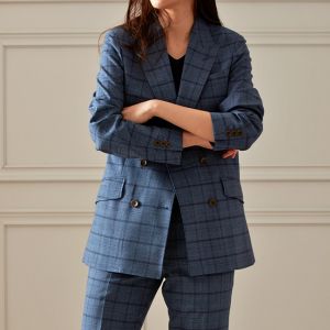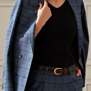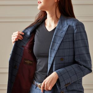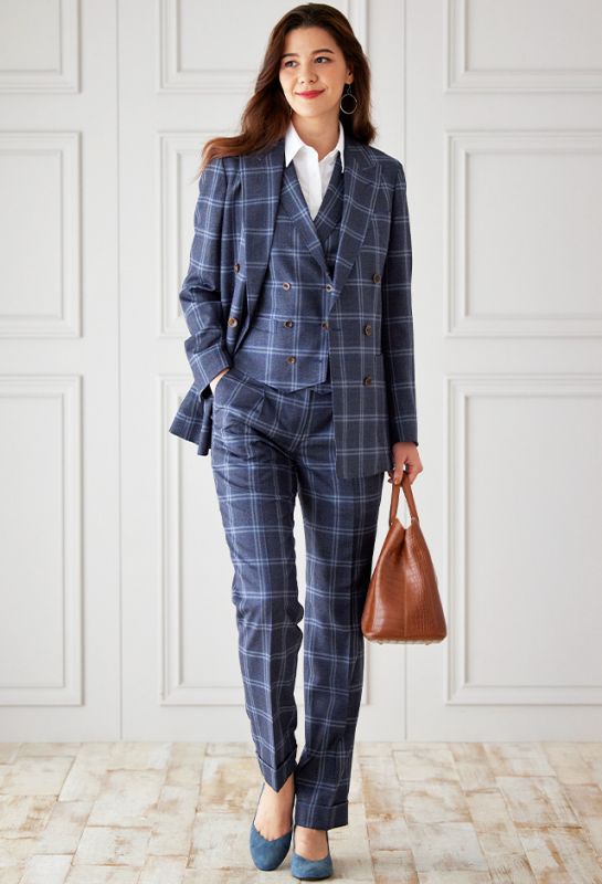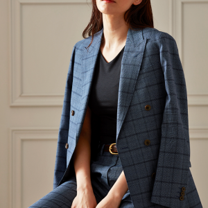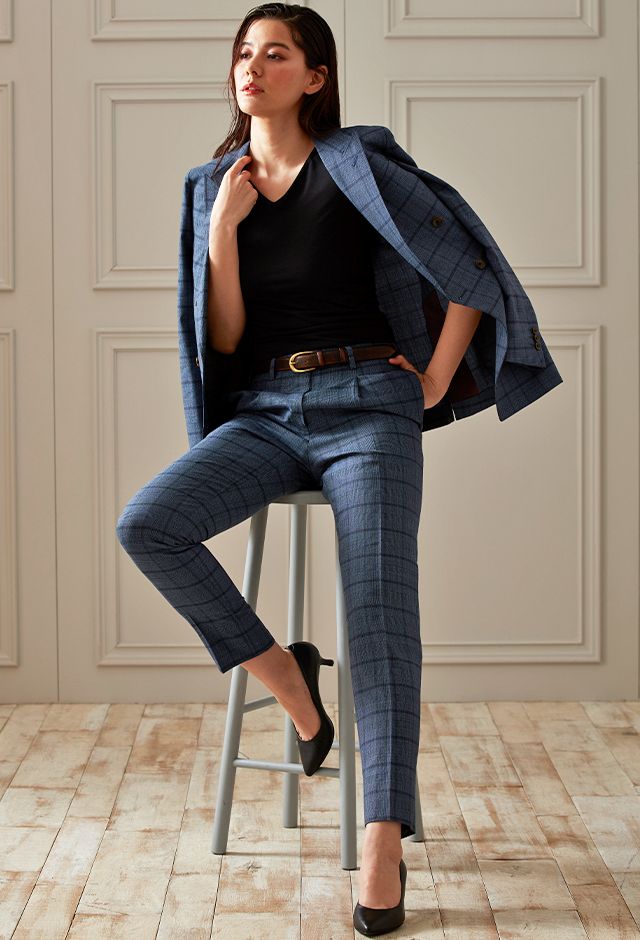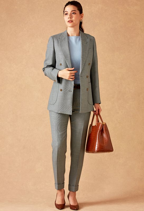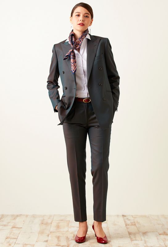 高品質でコストパフォーマンスに優れたイタリアブランド「カノニコ」で仕立てたスーツです。絶妙な色合いのブルーグレーカラーにチェックを組み合わせたスタイルで、春夏シーズンの生地になります。肩パットや芯地を極力排したアンコンモデル(ダブル)でジャケットを仕立てました。裏地は深みのあるボルドーカラー。ブラックのインナーを締め色に、シャープな印象に仕上げたコーデです。※こちらはメンズのモデルでお仕立てしたスーツになります。※生地在庫は変動いたしますのでご了承くださいませ。