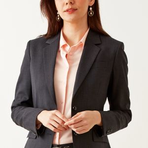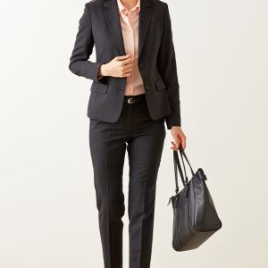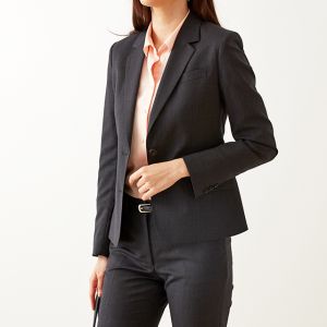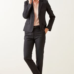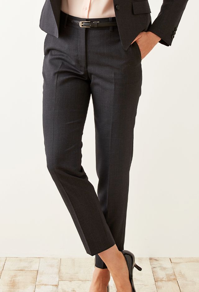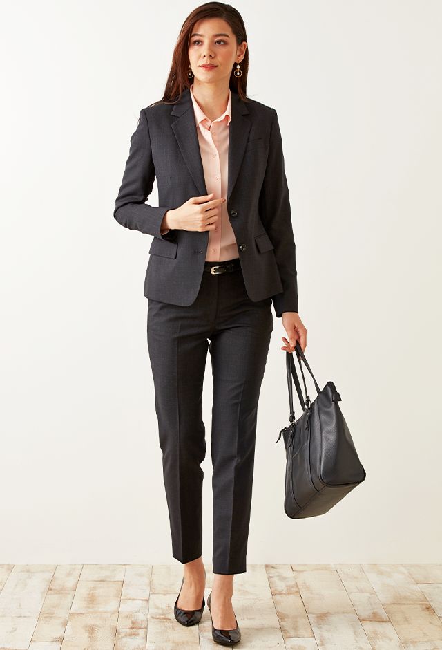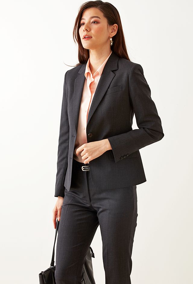 柔らかな質感、心地よい肌触り、形態安定性を併せ持つ高機能素材「ソロテックス」で仕立てたスーツです。レディースで注目度の高いチャコールグレーカラーにシンプルな無地のスタイルで、オールシーズン着用していただけます。ジャケットはテーラーギビングモデル(2つボタン)、ボトムスは人気のテーパードパンツで仕立てました。パンツの裾口はビジネスシーンにも最適でポピュラーなシングルタイプ。相性の良いピンクカラーのシャツと組み合わせたバランスの良いコーデです。※生地在庫は変動いたしますのでご了承くださいませ。