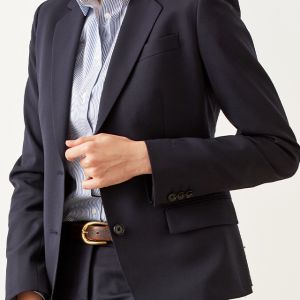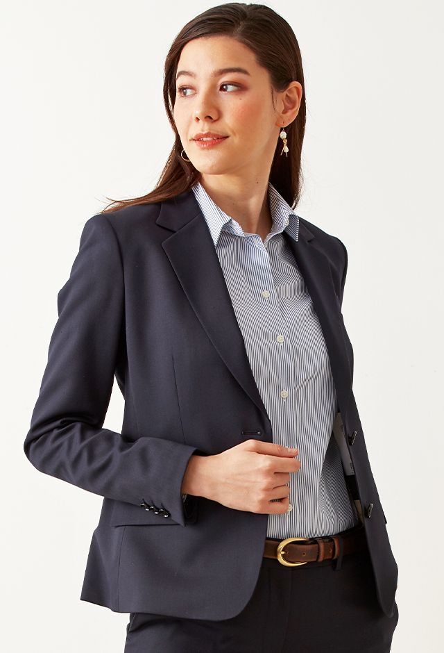 柔らかな質感、心地よい肌触り、形態安定性を併せ持つ高機能素材「ソロテックス」で仕立てたスーツです。定番のネイビーカラー×にシンプルな無地を組み合わせたスタイルで、オールシーズン着用していただけます。ジャケットはテーラーギビングモデル(2つボタン)、ボトムスはクールなセミフレアパンツで仕立てました。ジャケットはステッチを入れないことでよりシャープな印象に。ブルーのストライプシャツと合わせてビジネスシーンにも最適なコーデです。※生地在庫は変動いたしますのでご了承くださいませ。