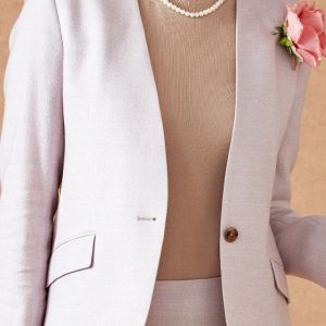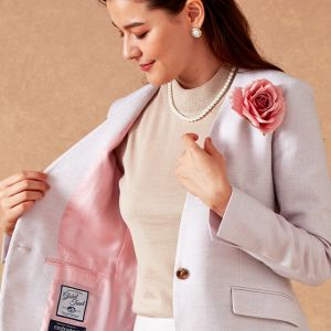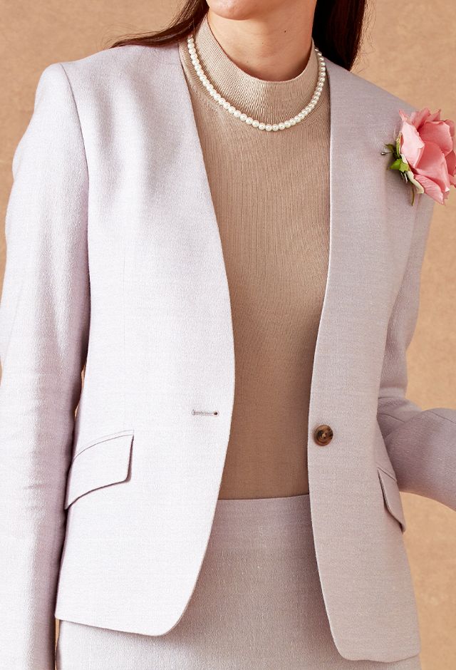 ストレッチ性の高い生地が大好評のイタリアブランド「トラバルド・トーニャ」で仕立てたスーツです。ペールトーンのピンクを光沢感のある素材に織り交ぜたスタイルで秋冬シーズンの生地になります。ジャケットはノーカラーモデル(ボタン)、ボトムスは定番のスカートで仕立てました。ジャケットには、存在感のあるボタンを選びアクセント。裏地には表地とあわせたピンクカラーをチョイス。ピンク系のトーンが異なる薔薇のブローチを差し色に、全体的に柔らかな印象のコーデです。※生地在庫は変動いたしますのでご了承くださいませ。