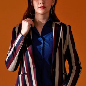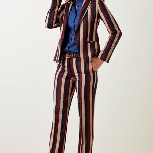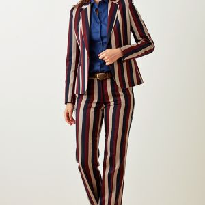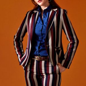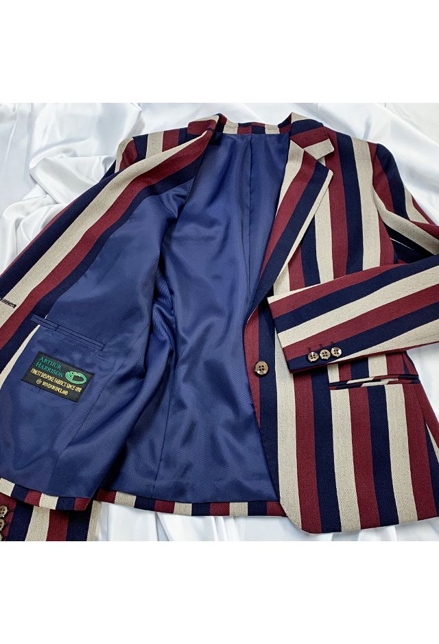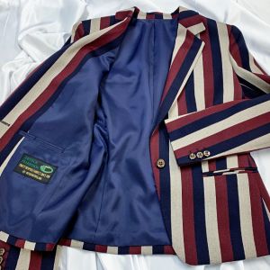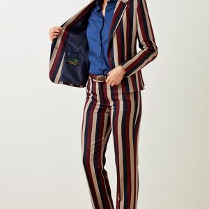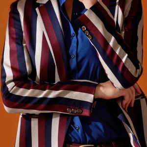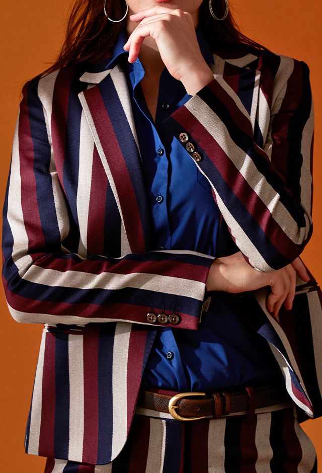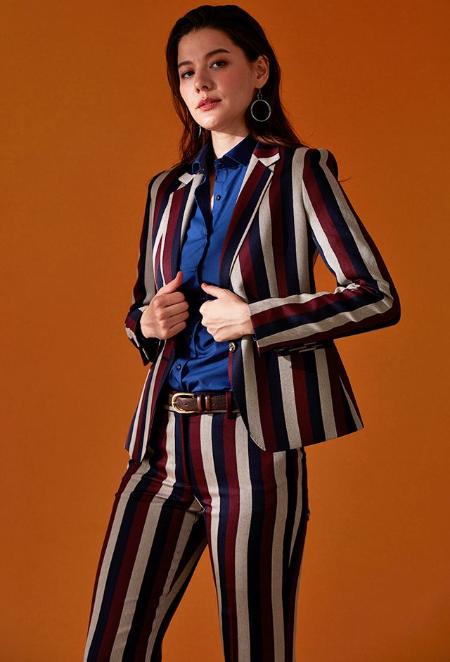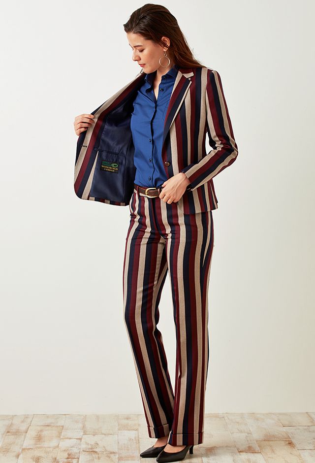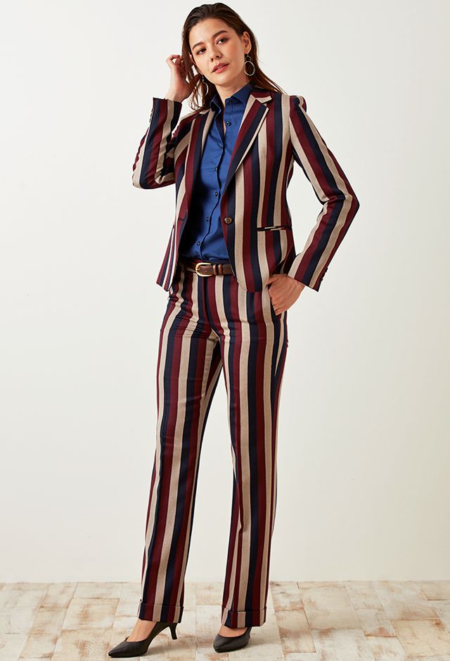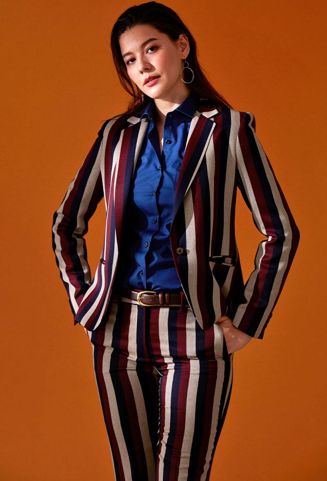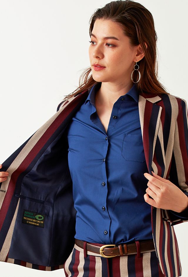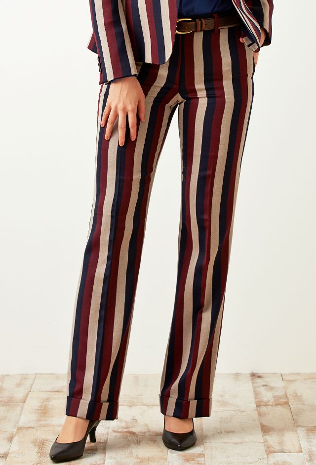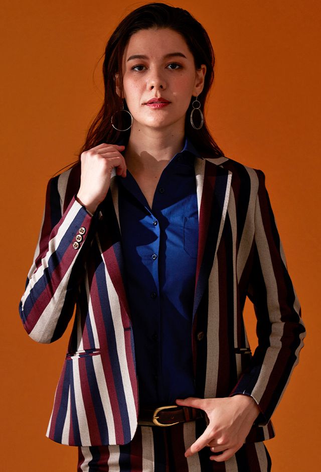 英国の伝統的な風合いと最新のファッション性を融合した「エドウィンウッドハウス」で仕立てたスーツです。パンチのきいた赤紺白を太めのストライプのスタイルでオールシーズン着用していただけます。ジャケットはテーラーギビングモデル(1つボタン)、ボトムスはクールなセミフレアパンツで仕立てました。ジャケットには、腰回りをすっきりと見せる効果のあるフラップ無しのポケットを採用。ブラックのパンプスと発色のいいブルーのワイシャツを合わせ、世界観のあるコーデに仕上げました。※生地在庫は変動いたしますのでご了承くださいませ。