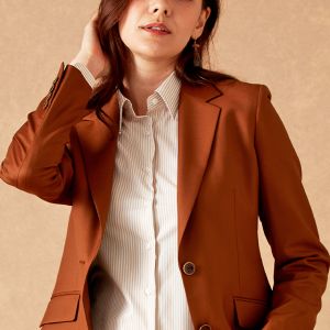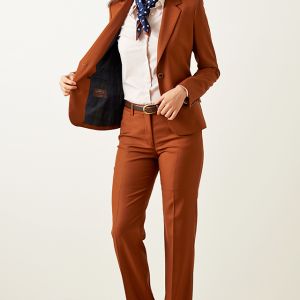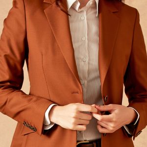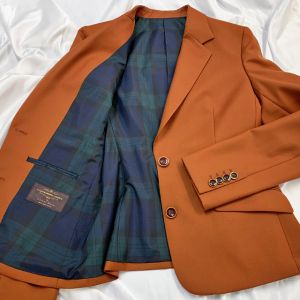高品質でコストパフォーマンスに優れたイタリアブランド「カノニコ」で仕立てたスーツです。艶がある発色の良いブラウンの無地のスタイルでオールシーズン着用していただけます。ジャケットはテーラーギビングモデル(2つボタン)、ボトムスはクールなセミフレアパンツで仕立てました。裏地には、グリーンのタータンチェック柄をチョイス。同系色のトーンを押さえたボタンを合わせました。ストライプシャツやドット柄のスカーフを取り入れた、メリハリのあるコーデです。※生地在庫は変動いたしますのでご了承くださいませ。