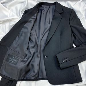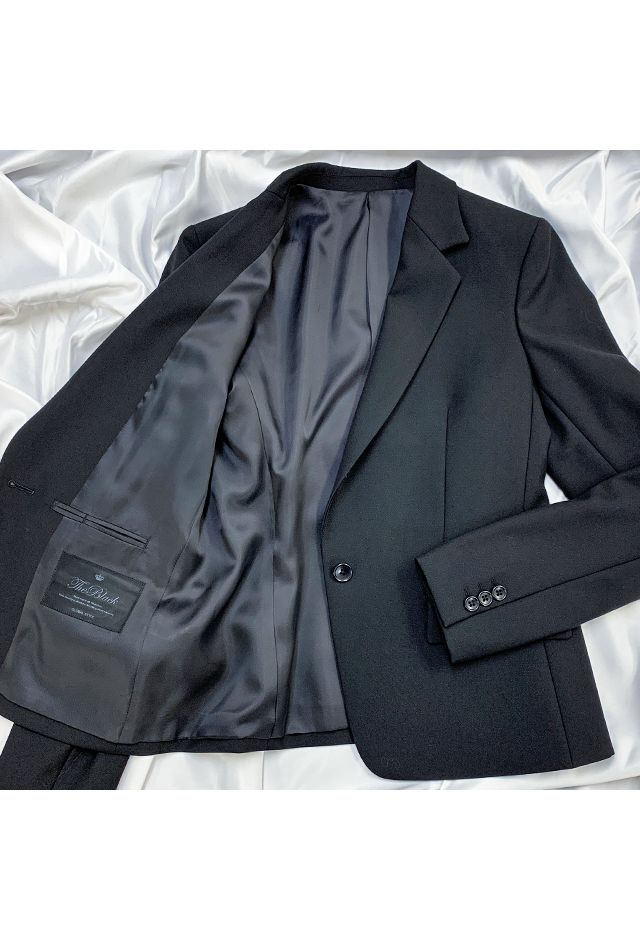 全て国産で作られた品のある生地感が特徴の「THE BLACK」で仕立てたスーツです。光沢を抑えたマットな生地感のブラックカラーで、オールシーズン着用していただけます。ジャケットはテーラーギビングモデル(1つボタン)、ボトムスは定番のスカートで仕立てました。ポケットは最もオーソドックスなフラップが付いた平行タイプを採用。モノトーンカラーでまとめた、冠婚葬祭で幅広く着用できるフォーマルスーツスタイルです。※生地在庫は変動いたしますのでご了承くださいませ。
