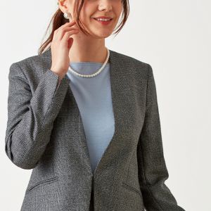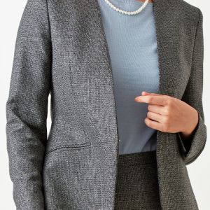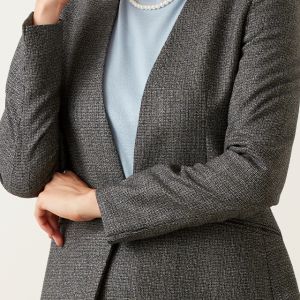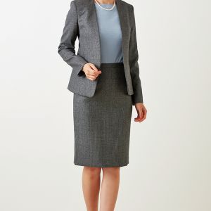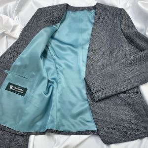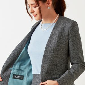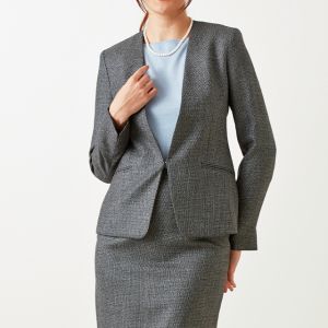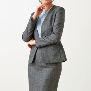 80ケ国以上にファンを持つ世界的なイギリスブランド「ドーメル」で仕立てたスーツです。ツイードの織り目の入った美しいグレーと無地を組み合わせたスタイルで、秋冬シーズンの生地になります。ジャケットはノーカラーモデル(ホック)、ボトムスは定番のスカートで仕立てました。ジャケットには、腰回りをすっきりと見せる効果のあるフラップ無しのポケットを採用。インナーには、ペールトーンの水色のニットを合わせて落ち着いた印象のコーデです。※生地在庫は変動いたしますのでご了承くださいませ。