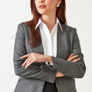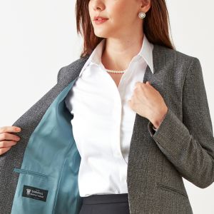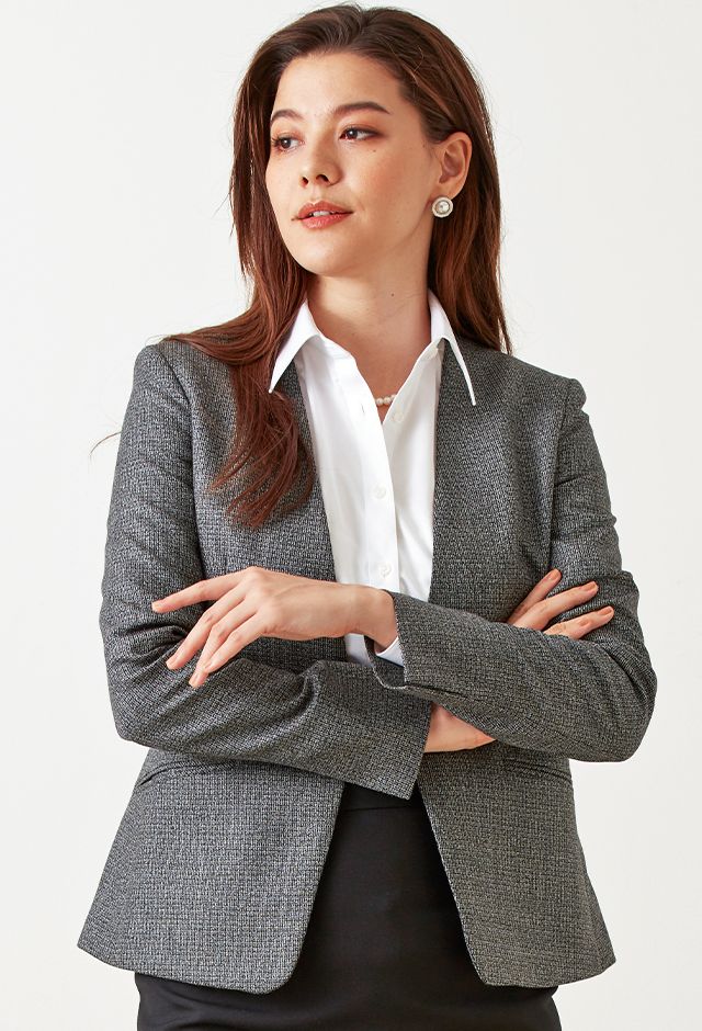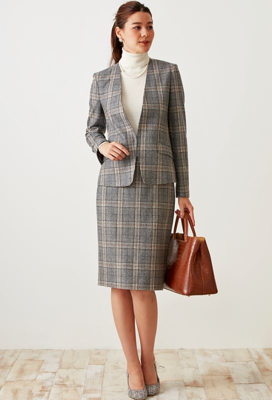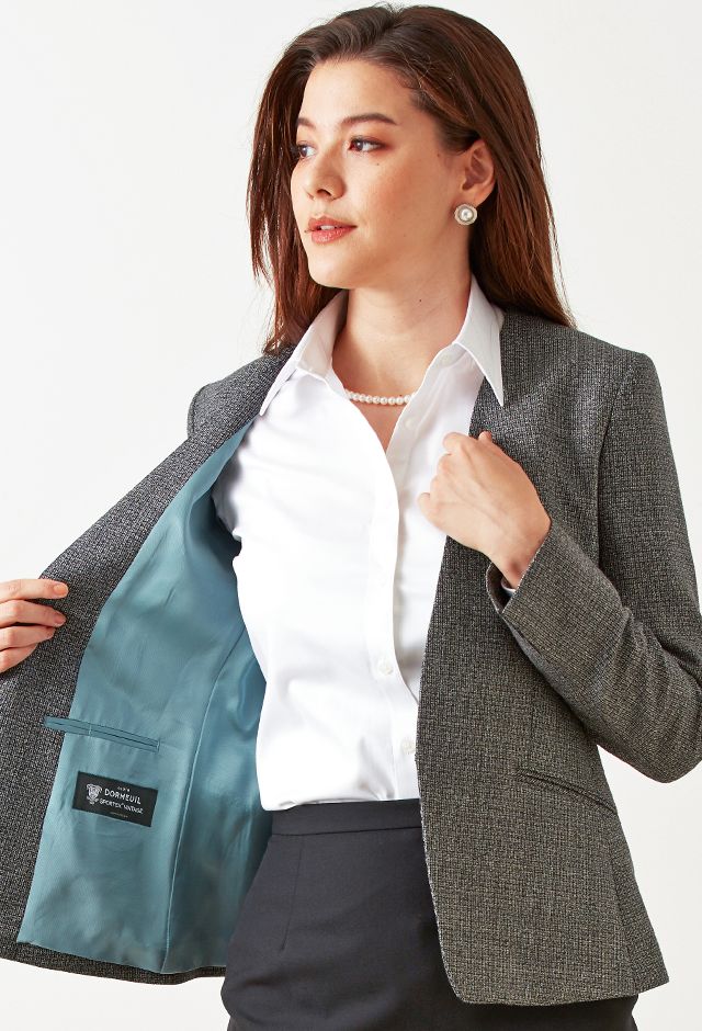80ケ国以上にファンを持つ世界的なイギリスブランド「ドーメル」で仕立てたスーツです。ツイードの織り目の入った美しいグレーと無地を組み合わせたスタイルで、秋冬シーズンの生地になります。ジャケットはノーカラーモデル(ホック)、ボトムスは定番のスカートで仕立てました。裏地には爽やかで発色のあるライトグリーンをチョイスしてさりげないアクセントを加えました。スカートにはブラックを使用し、全体をひきしめて3色コーデに仕上げました。※生地在庫は変動いたしますのでご了承くださいませ。