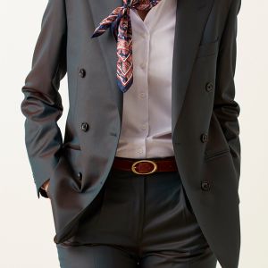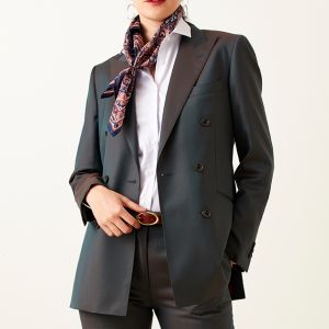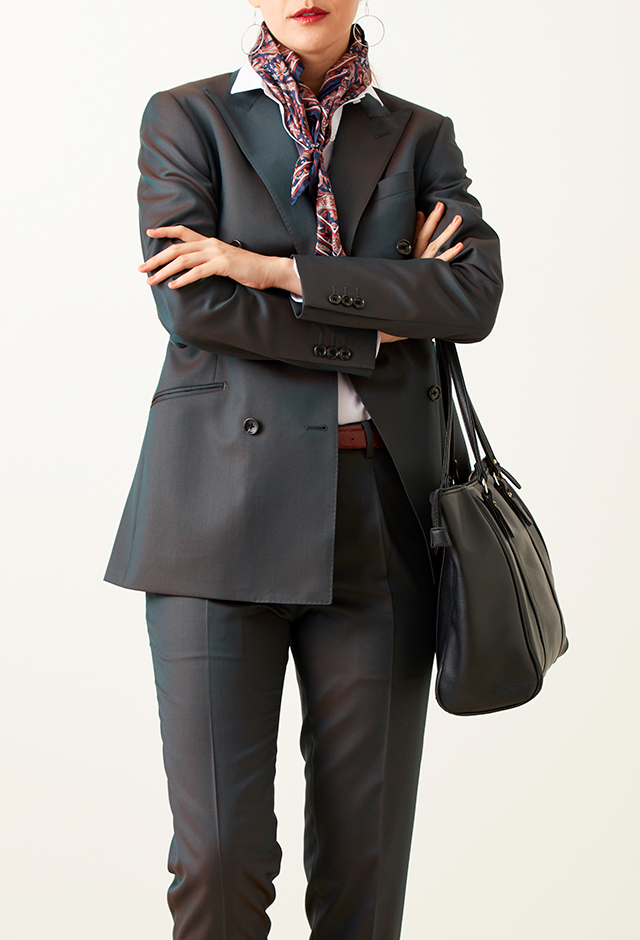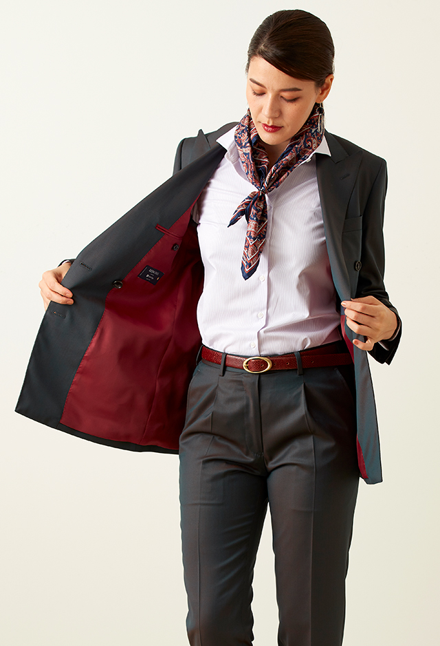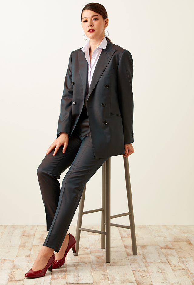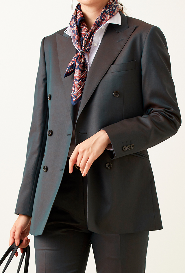 クラシカルからファンシーなデザインまで幅広く生み出すイタリアブランド「レダ」で仕立てたスーツです。ダークトーンのカーキ×角度によって色が変わるソラーロ生地のスタイルでオールシーズン着用していただけます。大人の色気を醸し出す優美なフォルムが特徴のモダンクラシックモデル(ダブル)で仕立てました。ボタンにはブラックを選び、ジャケットの重厚感を高めた仕上がり。裏地にはインパクトあるレッドをチョイス。スカーフで色をはずし、可憐な印象も織り交ぜたメンズライクコーデです。※こちらはメンズのモデルでお仕立てしたスーツになります。※生地在庫は変動いたしますのでご了承くださいませ。