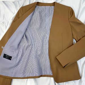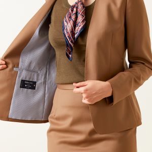クラシカルからファンシーなデザインまで幅広く生み出すイタリアブランド「レダ」で仕立てたスーツです。上品で明るめなブラウンの無地のスタイルで、オールシーズン着用していただけます。ジャケットはノーカラーモデル(ホック)、ボトムスは定番のスカートで仕立てました。ペールトーンの薄紫色の裏地で、さりげないお洒落をお楽しみいただけます。ペイズリー柄のスカーフをあしらい、彩りと首元のバランスのとれたコーデです。※生地在庫は変動いたしますのでご了承くださいませ。
