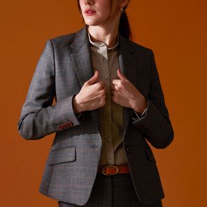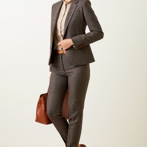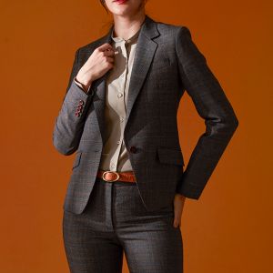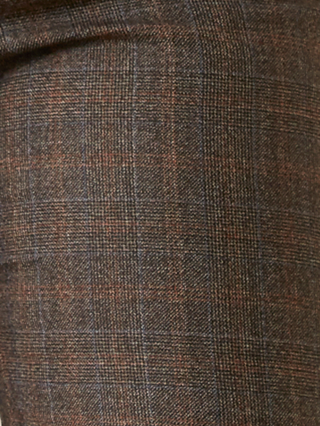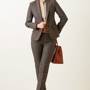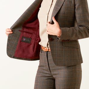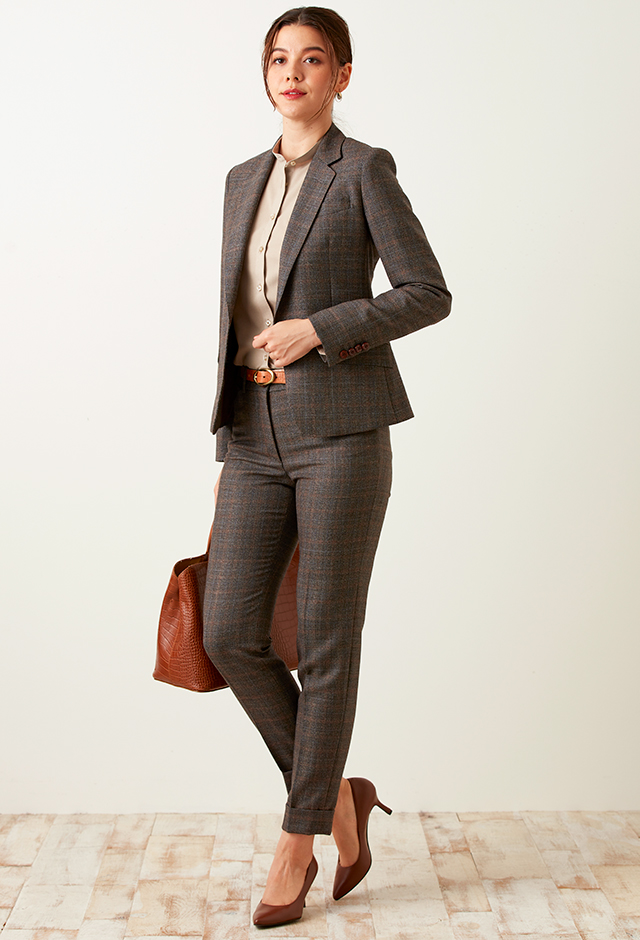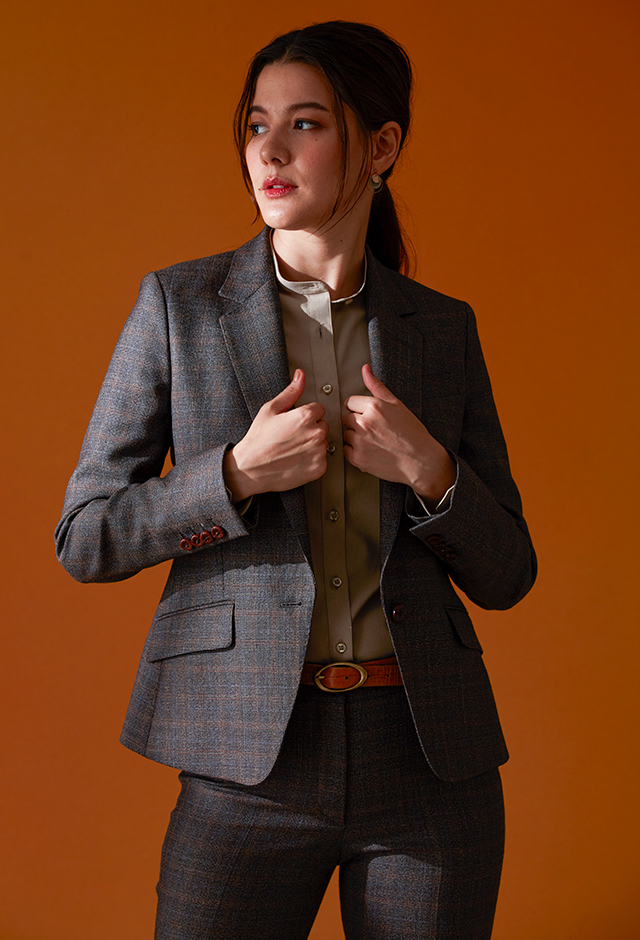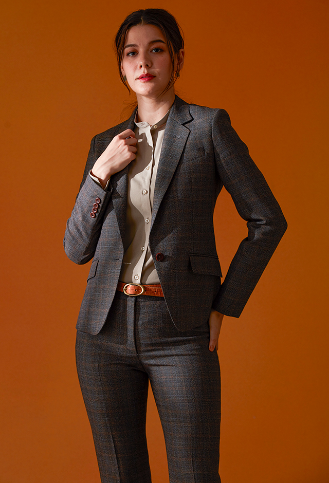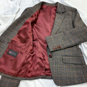 英国的な生地を作りだす知る人ぞ知る高級ブランド「サヴィル・クリフォード」で仕立てたスーツです。ブラウンに同系色の明るいチェック柄をあしらったスタイルで、秋冬シーズンの生地になります。ジャケットはテーラーギビングモデル(1つボタン)、ボトムスは人気のテーパードパンツで仕立てました。裏地には印象的な赤いドット柄。パンツの裾は、カジュアルな印象ながらビジネスシーンにも使えるダブルタイプ。小物もすべて同系色の温かい色合いで統一し、季節感のあるコーデに仕上げました。※生地在庫は変動いたしますのでご了承くださいませ。
