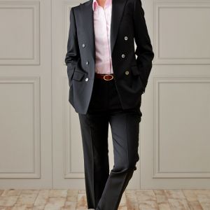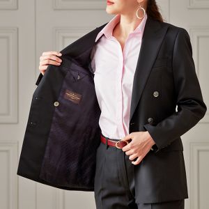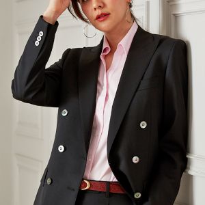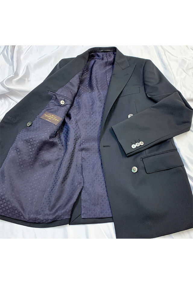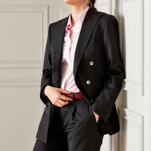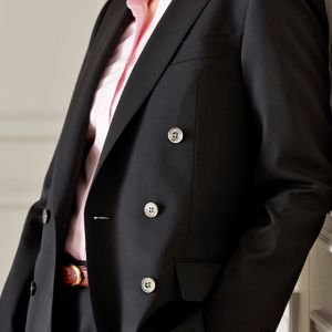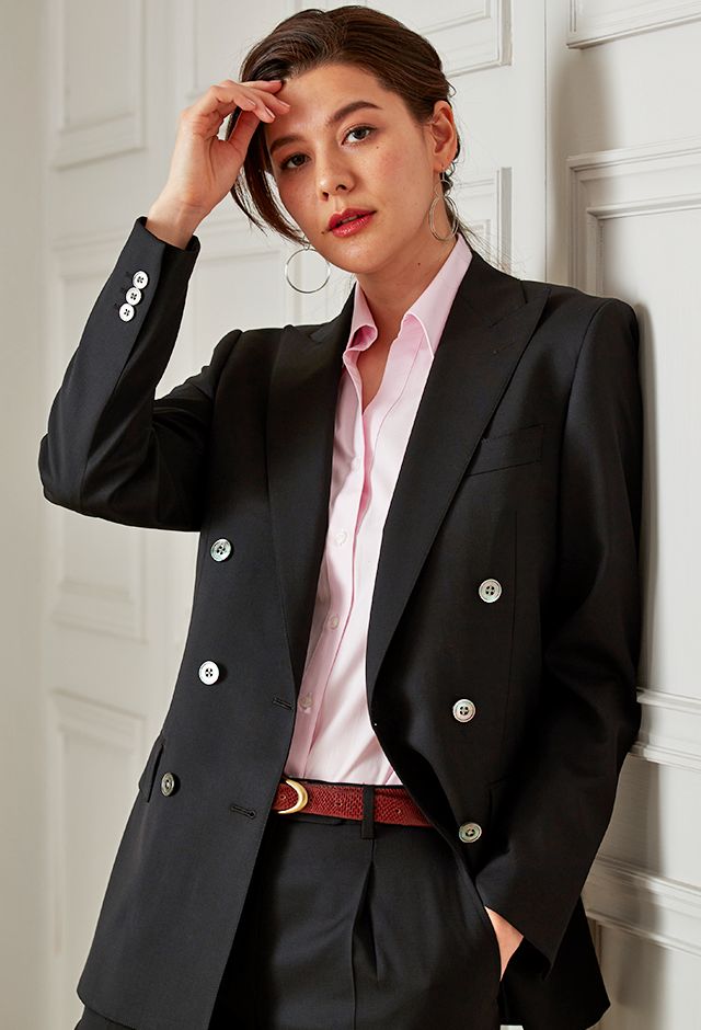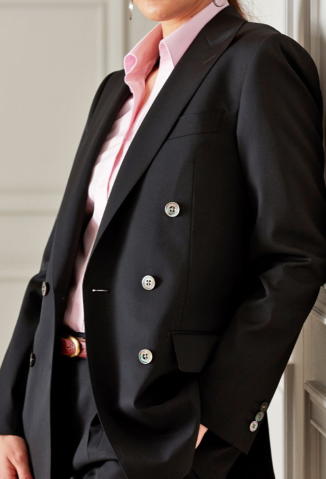 高品質でコストパフォーマンスに優れたイタリアブランド「カノニコ」で仕立てたスーツです。ツヤ感のあるブラックの無地の生地で、オールシーズン着用していただけます。大人の色気を醸し出す優美なフォルムが特徴のモダンクラシックモデル(ダブル)で仕立てました。パンツはカジュアルな印象ながらビジネスシーンにも使えるダブルタイプ。インナーは襟付きのシャツでより一層大人のクールコーデに。※こちらはメンズモデルでお仕立てしたスーツになります。※生地在庫は変動いたしますのでご了承くださいませ。