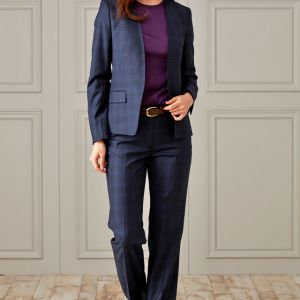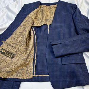 世界中のセレブリティから支持を得ているラグジュアリーブランド「ロロ・ピアーナ」で仕立てたスーツです。ネイビーのベースに同系色のチェック柄をあしらった生地でオールシーズン着用していただけます。ジャケットはノーカラーモデル(ホック)、ボトムスはクールなセミフレアパンツで仕立てました。裏地には金色のペイズリー柄でエレガントさをプラス。インナーにはトーンを抑えたパープルのニットを合わせ、大人コーデのアクセントに。※生地在庫は変動いたしますのでご了承くださいませ。