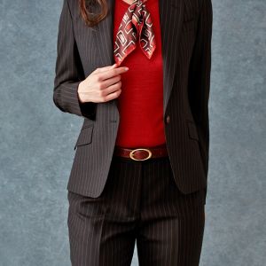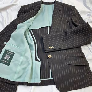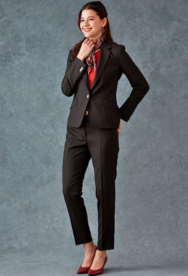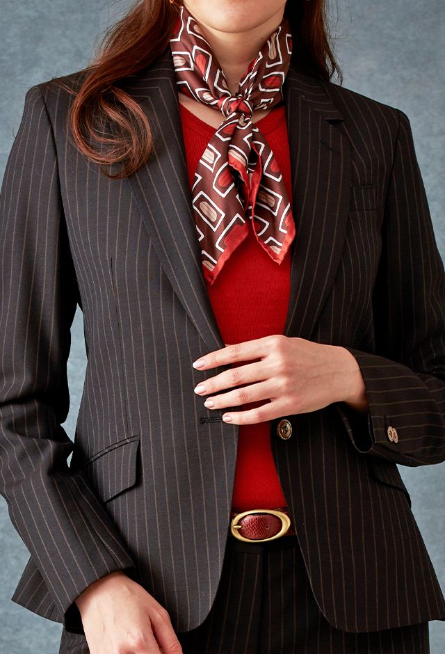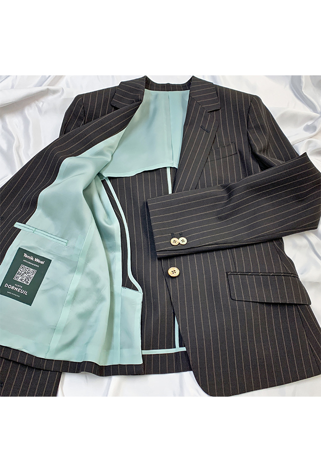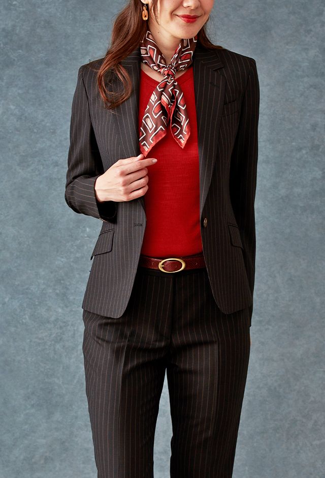 80ケ国以上にファンを持つ世界的なイギリスブランド「ドーメル」で仕立てたスーツです。ブラウンのストライプ柄の生地で、オールシーズン着用していただけます。ジャケットはテーラーギビングモデル(1つボタン)、ボトムスは人気のテーパードパンツで仕立てました。裏地には爽やかなミントグリーンをチョイス。袖のボタンは2つで軽やかな印象に。スーツと同じ暖色系の赤のニットと赤のスカーフで色どりを添えた、統一感あるコーデに仕上げました。※生地在庫は変動いたしますのでご了承くださいませ。
