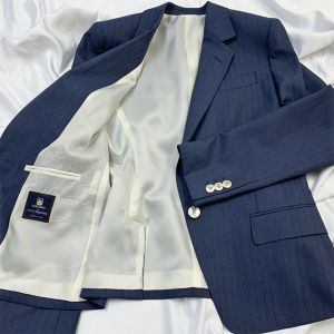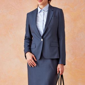 最高級ブランドに使われる素材を生み出すイタリアブランド「ルイージ・コロンボ」で仕立てたスーツです。定番のネイビーカラーにシャドーストライプ柄の入ったクールなスタイルで、春夏シーズンの生地になります。ジャケットはテーラーギビングモデル(1つボタン)、ボトムスは定番のスカートで仕立てました。ポケットは最もオーソドックスなフラップが付いた平行タイプを採用。柔らかい印象の丸襟のシャツを合わせ、品のあるコーデに仕上げました。※生地在庫は変動いたしますのでご了承くださいませ。