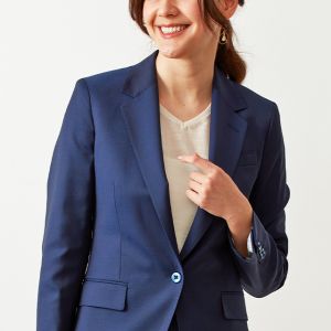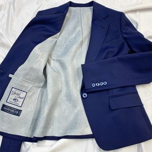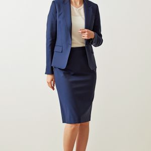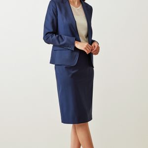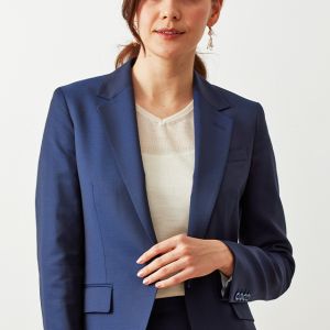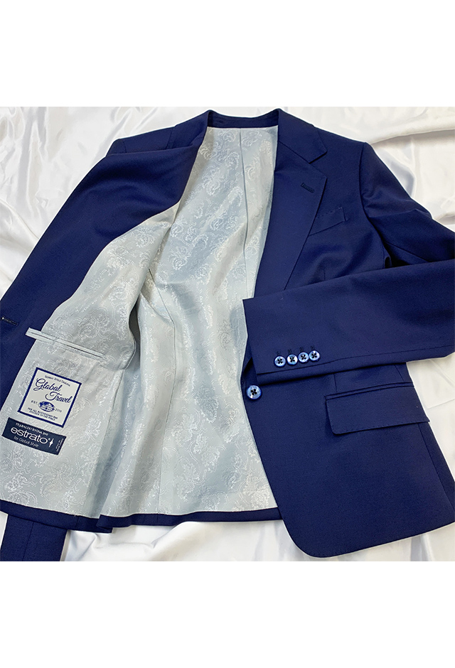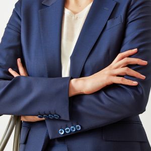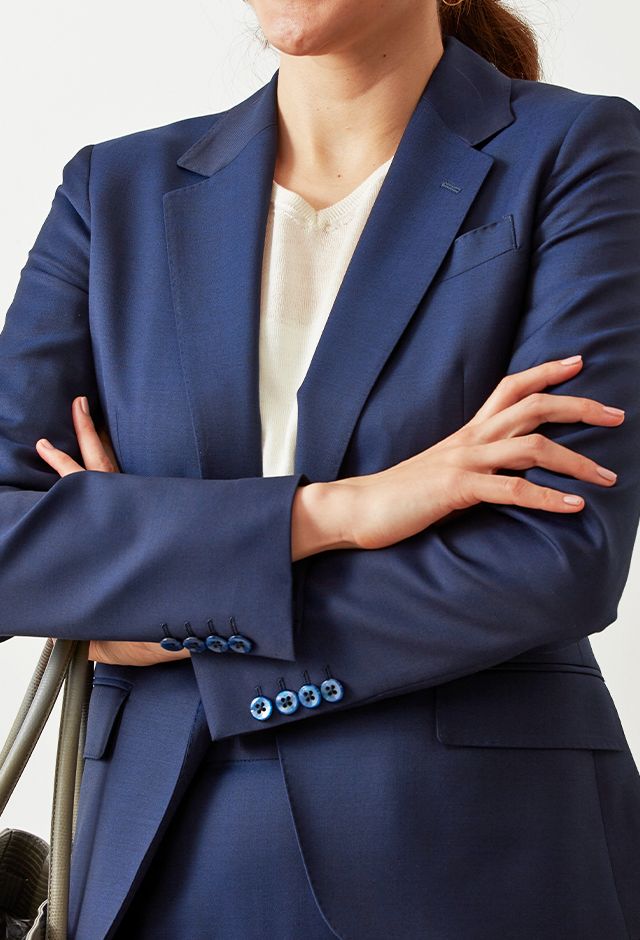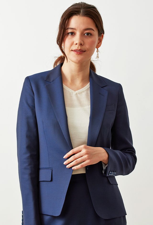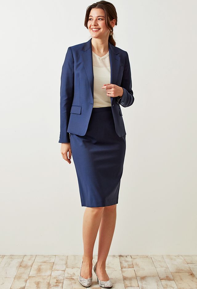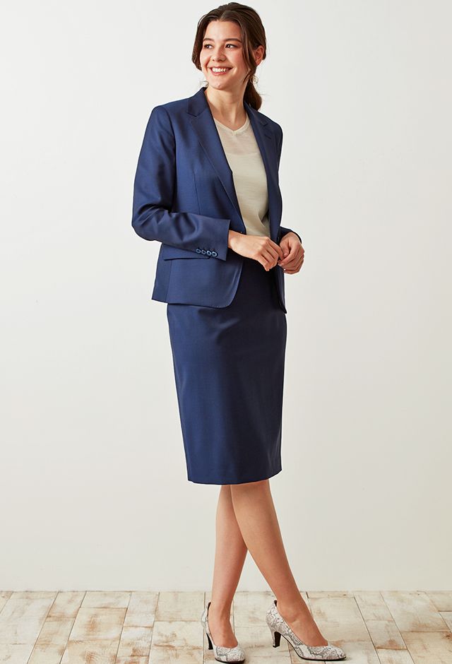 ストレッチ性の高い生地が大好評のイタリアブランド「トラバルド・トーニャ」で仕立てたスーツです。使えるシーンが多く、人気のネイビーの無地で春夏シーズンの生地になります。ジャケットはテーラーギビングモデル(1つボタン)、ボトムスは定番のスカートで仕立てました。ボタンには、スーツと同系色の青ボタンをチョイスし、でさりげない輝きを演出。インナーにはVネックのニットを合わせて、クールな印象のコーデに仕上げました。※生地在庫は変動いたしますのでご了承くださいませ。