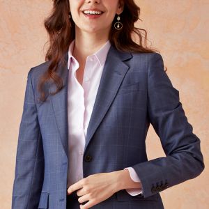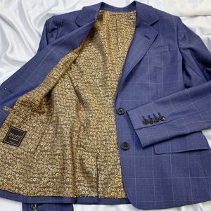 雨が多く多湿な気候を有する市場においても絶大な評価を獲得している「ドラゴ」で仕立てたスーツです。絶妙な色合いのブルーグレーカラーにチェック柄が入った、春夏シーズンの生地になります。ジャケットはテーラーギビングモデル(2つボタン)、ボトムスは定番のスカートで仕立てました。ゴールドであしらった模様の裏地をチョイスし、エレガントな印象をプラス。シャツにはペールトーンを合わせて、ほどよく柔和な印象のコーデに仕上げました。※生地在庫は変動いたしますのでご了承くださいませ。