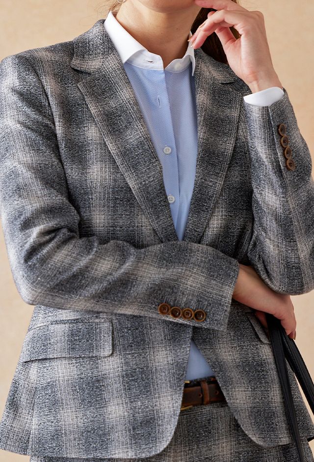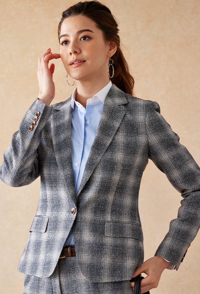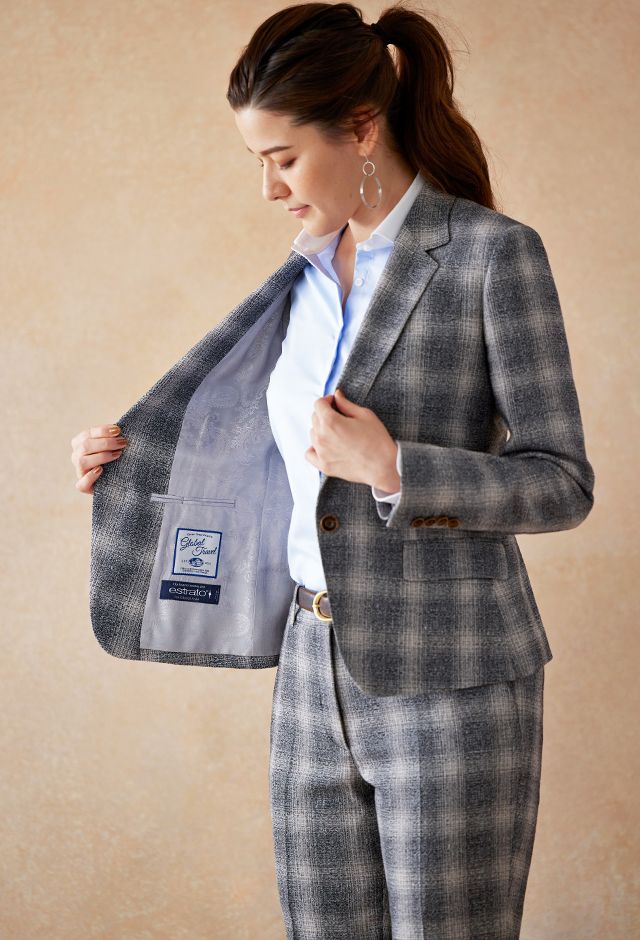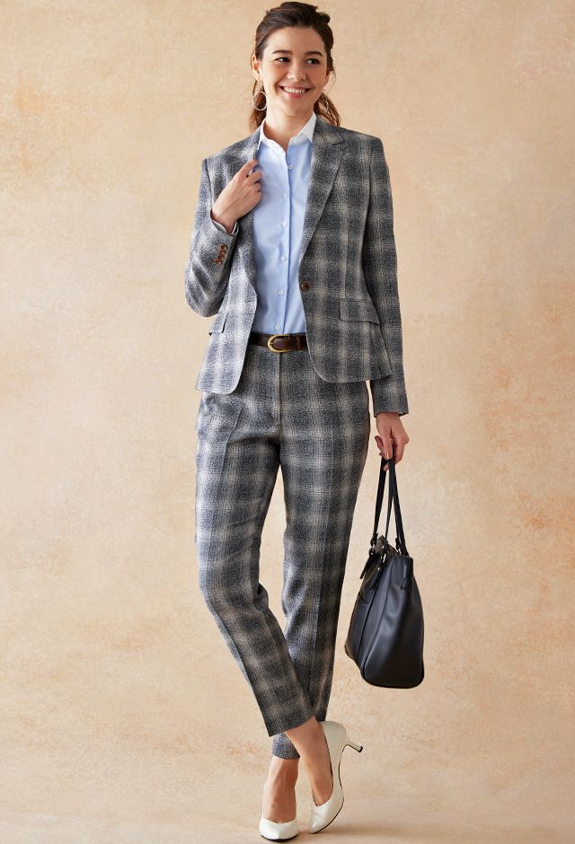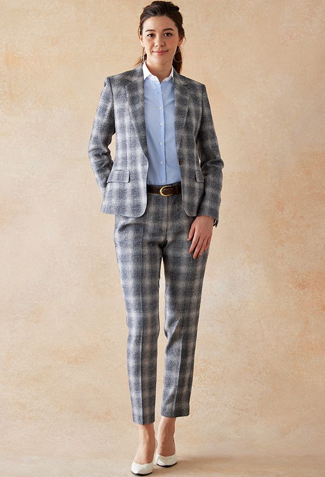 ストレッチ性の高い生地が大好評のイタリアブランド「トラバルド・トーニャ」で仕立てたスーツです。グレーの色味にオフホワイトのグラデーションが重なったチェック柄で、秋冬シーズンの生地になります。ジャケットはテーラーギビングモデル(1つボタン)、ボトムスは人気のテーパードパンツで仕立てました。裏地にはシルバーグレーのペイズリー柄で上品さを演出。ボトムスの裾口はカジュアルな印象ながらビジネスシーンにも使えるダブルタイプ。同じく同系色のホワイトのパンプスを組み合わせて、爽やかで大人びた印象のコーデに仕上げました。※生地在庫は変動いたしますのでご了承くださいませ。