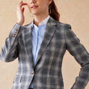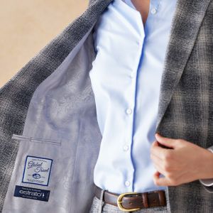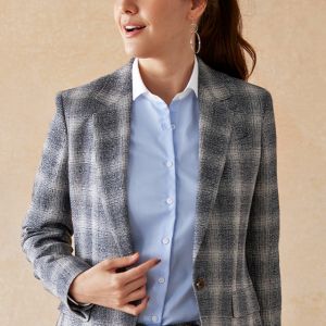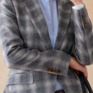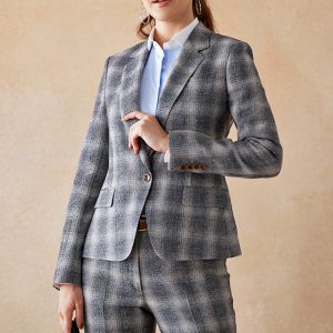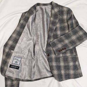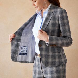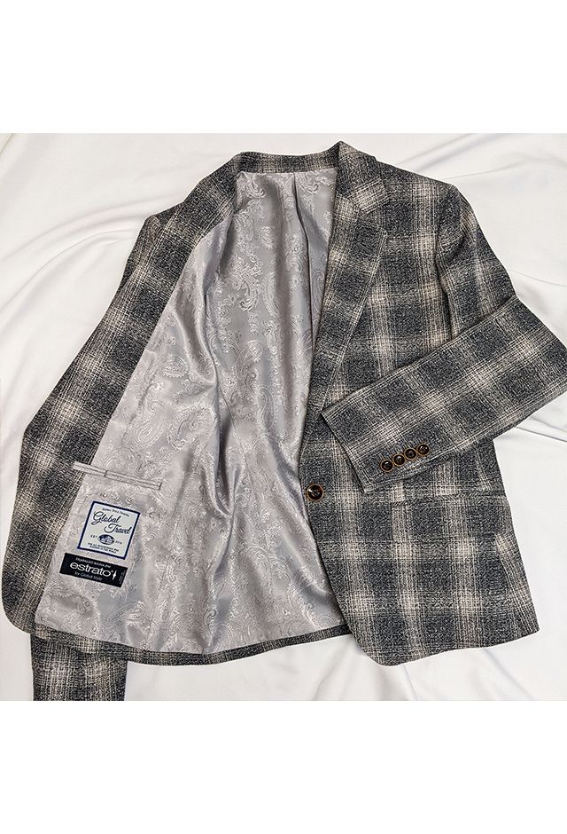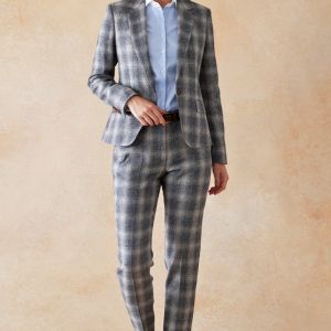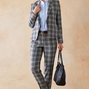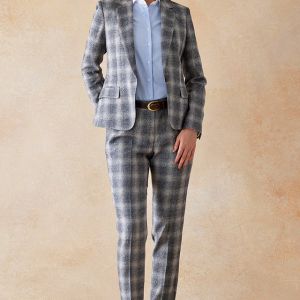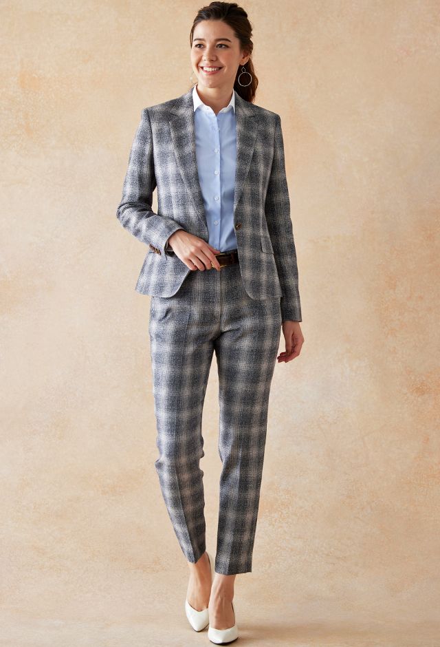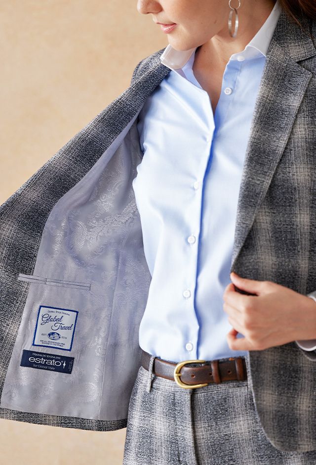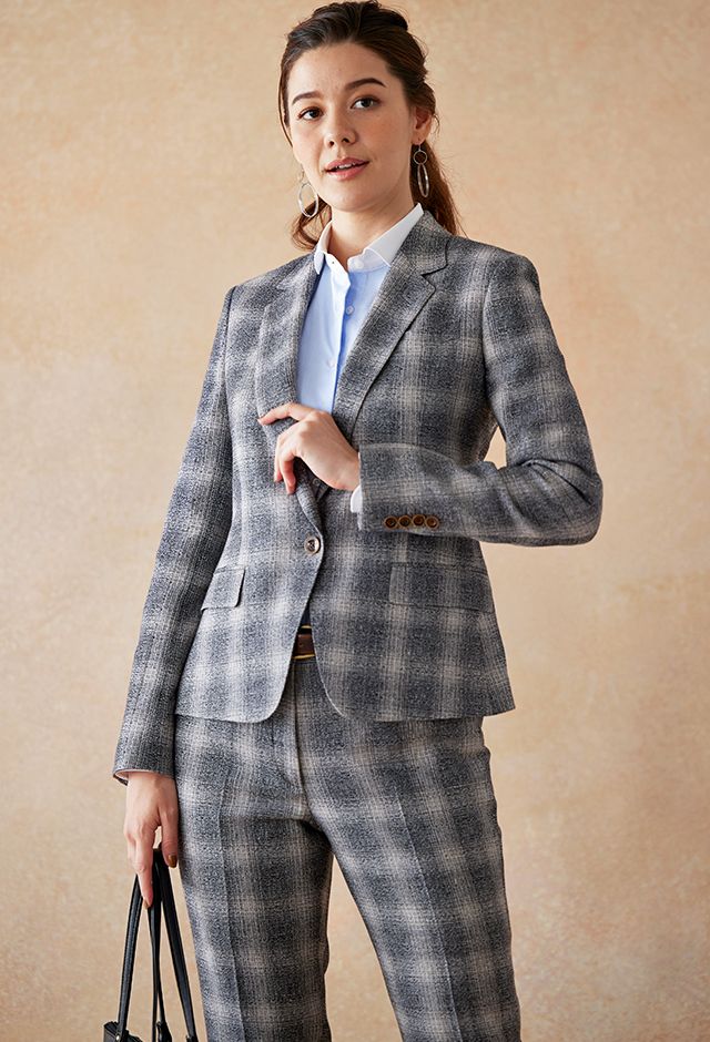 ストレッチ性の高い生地が大好評のイタリアブランド「トラバルド・トーニャ」で仕立てたスーツです。グレーの色味にオフホワイトのグラデーションが重なったチェック柄で、秋冬シーズンの生地になります。ジャケットはテーラーギビングモデル(1つボタン)、ボトムスは人気のテーパードパンツで仕立てました。裏地にはシルバーグレーのペイズリー柄で上品さを演出。ボトムスの裾口はカジュアルな印象ながらビジネスシーンにも使えるダブルタイプ。同じく同系色のホワイトのパンプスを組み合わせて、爽やかで大人びた印象のコーデに仕上げました。※生地在庫は変動いたしますのでご了承くださいませ。