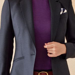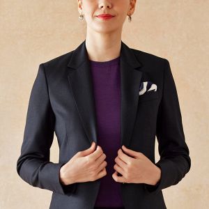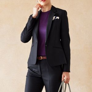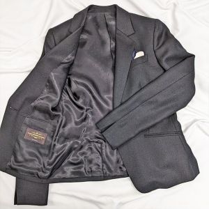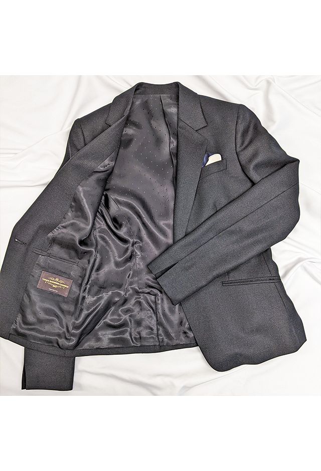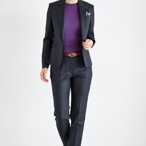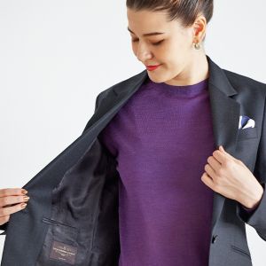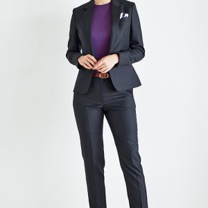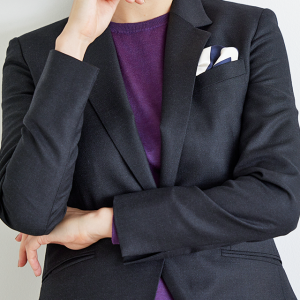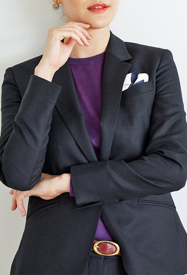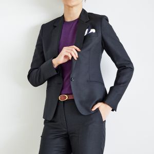 高品質でコストパフォーマンスに優れたイタリアブランド「カノニコ」で仕立てたスーツです。ブラックカラーに立体感のあるバーズアイ柄のスタイルで、オールシーズン着用していただけます。ジャケットはテーラーギビングモデル(1つボタン)、ボトムスは人気のテーパードパンツで仕立てました。パンツの裾口はビジネスシーンにも最適でポピュラーシングルタイプ。裏地にもブラックを取り入れブラックスーツで統一感を出しつつ、インナーやパンプスはパープルやレッドなどの色を使い大人な印象のコーデに仕上げました。※生地在庫は変動いたしますのでご了承くださいませ。