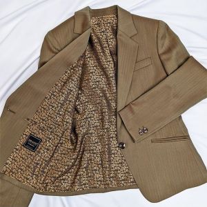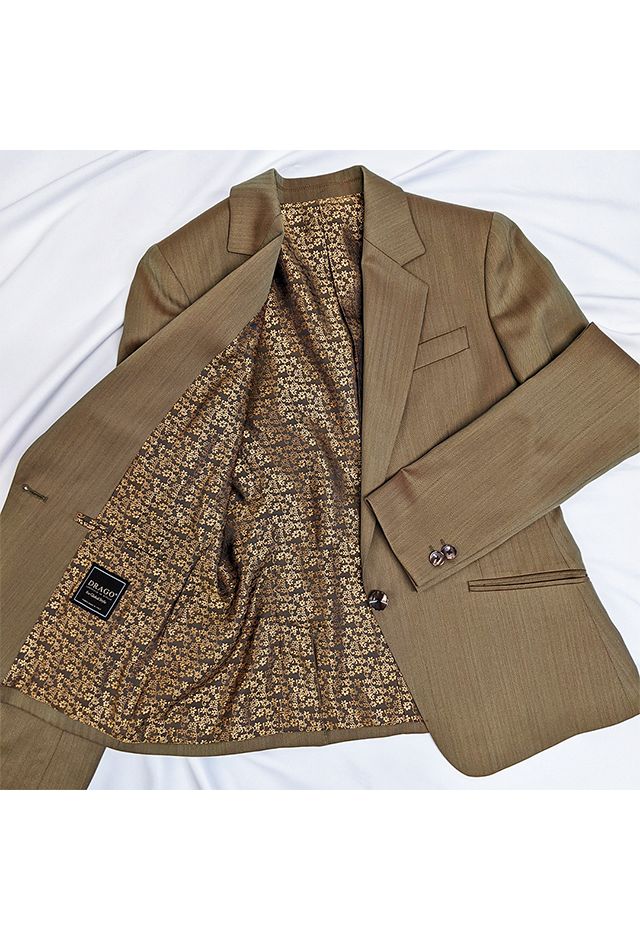雨が多く多湿な気候を有する市場においても絶大な評価を獲得している「ドラゴ」で仕立てたスーツです。ベージュカラー×角度によって色が変わるソラーロ生地のスタイルで、オールシーズン着用していただけます。ジャケットはテーラーギビングモデル(1つボタン)、ボトムスはクールなセミフレアパンツで仕立てました。裏地には花柄をチョイスし可愛らしい雰囲気に。フラップ無し(ふた無し)のポケットでスッキリと。レッドのニットで色を締め、ゴールドのアクセサリーで上品なコーデに仕上げました。※生地在庫は変動いたしますのでご了承くださいませ。