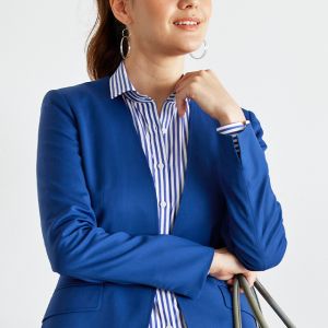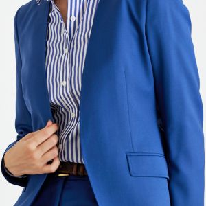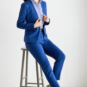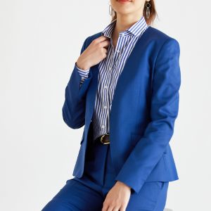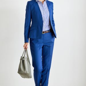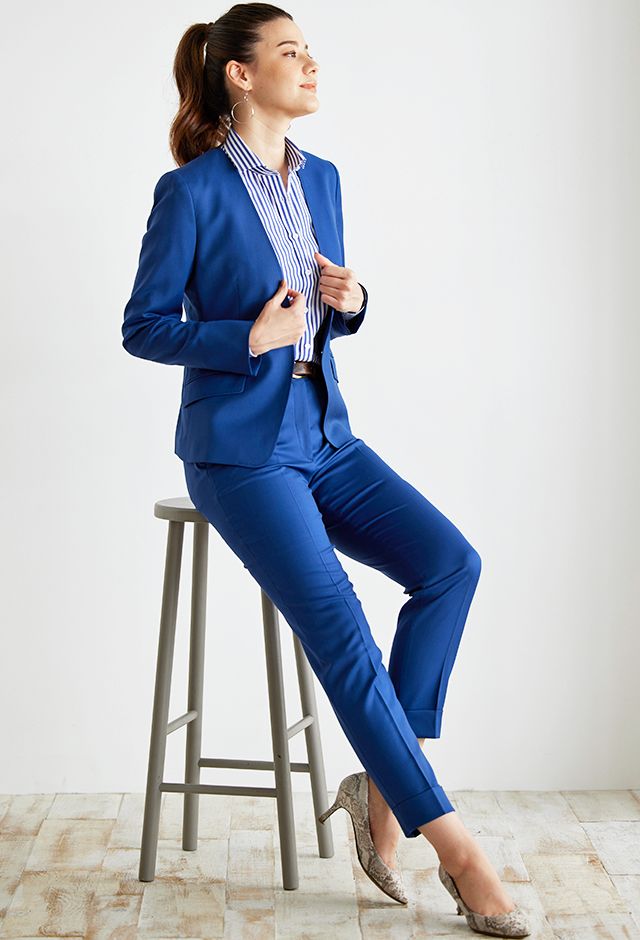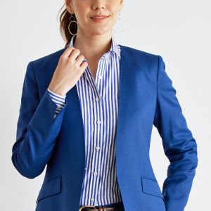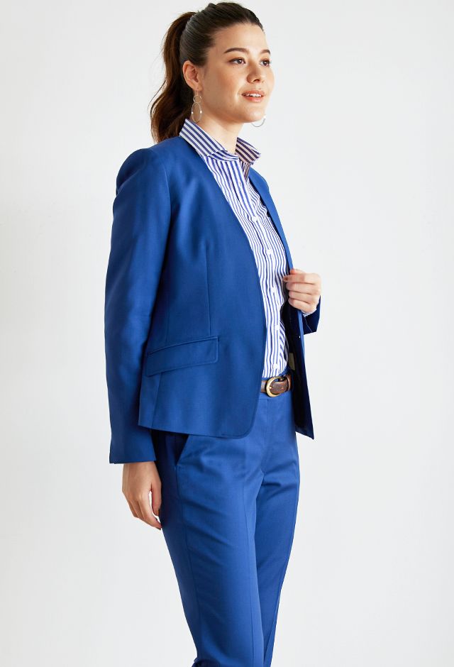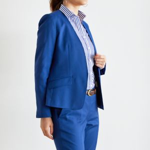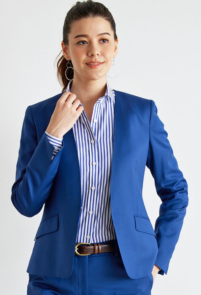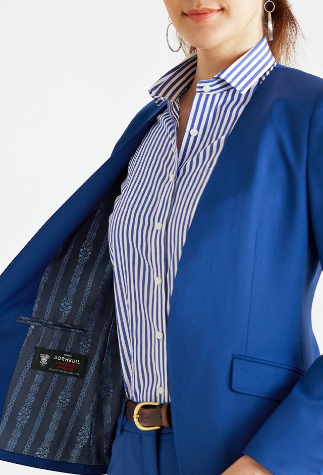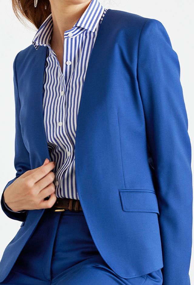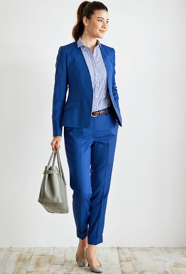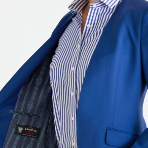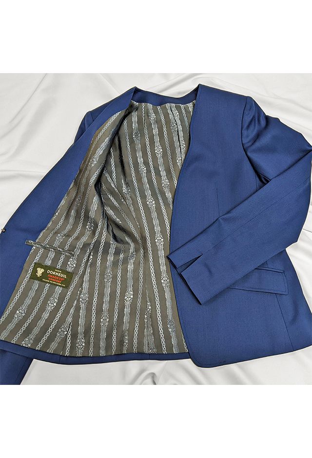80ケ国以上にファンを持つ世界的なイギリスブランド「ドーメル」で仕立てたスーツです。鮮やかな発色の明るいトーンのブルー×無地のスタイルで、オールシーズン着用していただけます。ジャケットはノーカラーモデル(ホック)、ボトムスは人気のテーパードパンツで仕立てました。ポケットは斜め(スラント)に、袖口はスリットタイプでスッキリと。ストライプ柄のシャツを合わせてスタイリッシュで爽やかな印象に仕上げました。※生地在庫は変動いたしますのでご了承くださいませ。