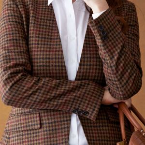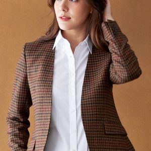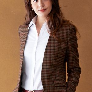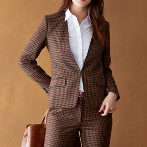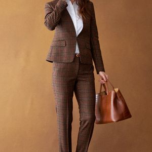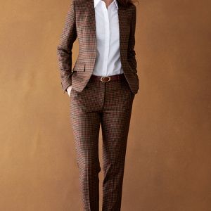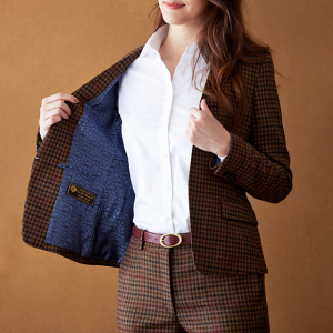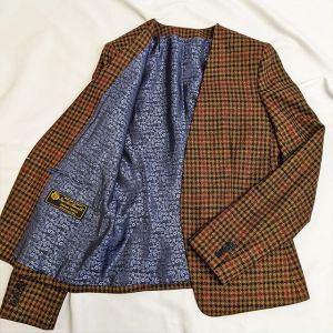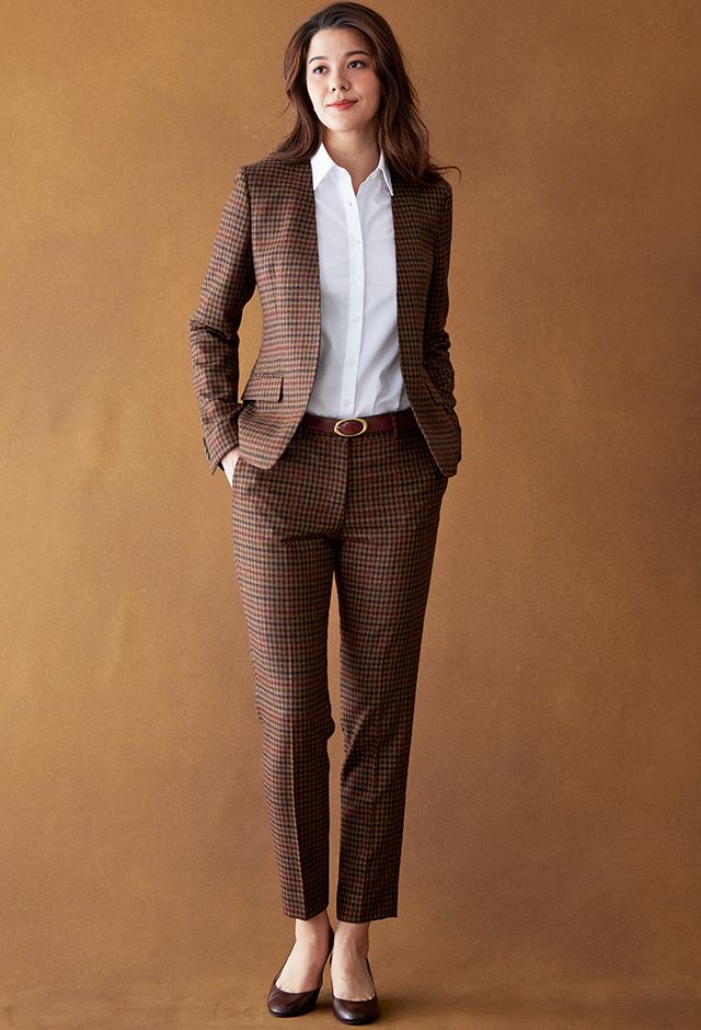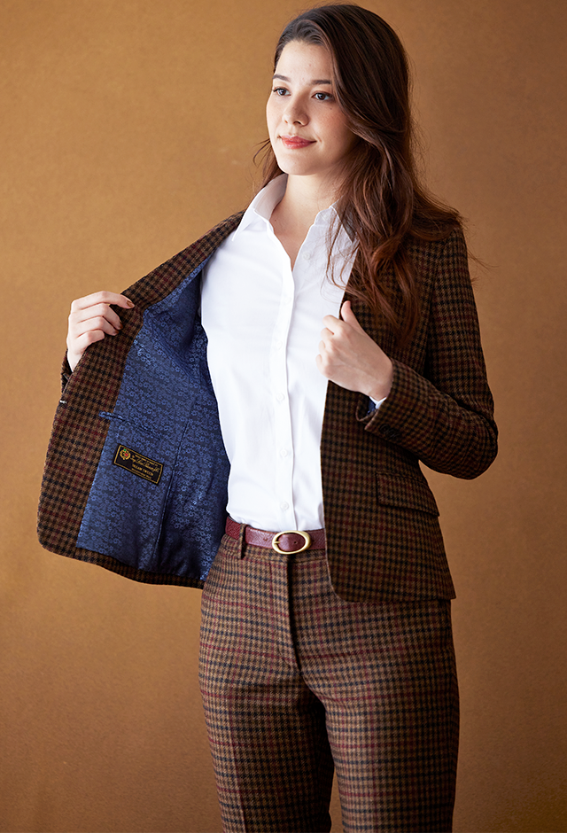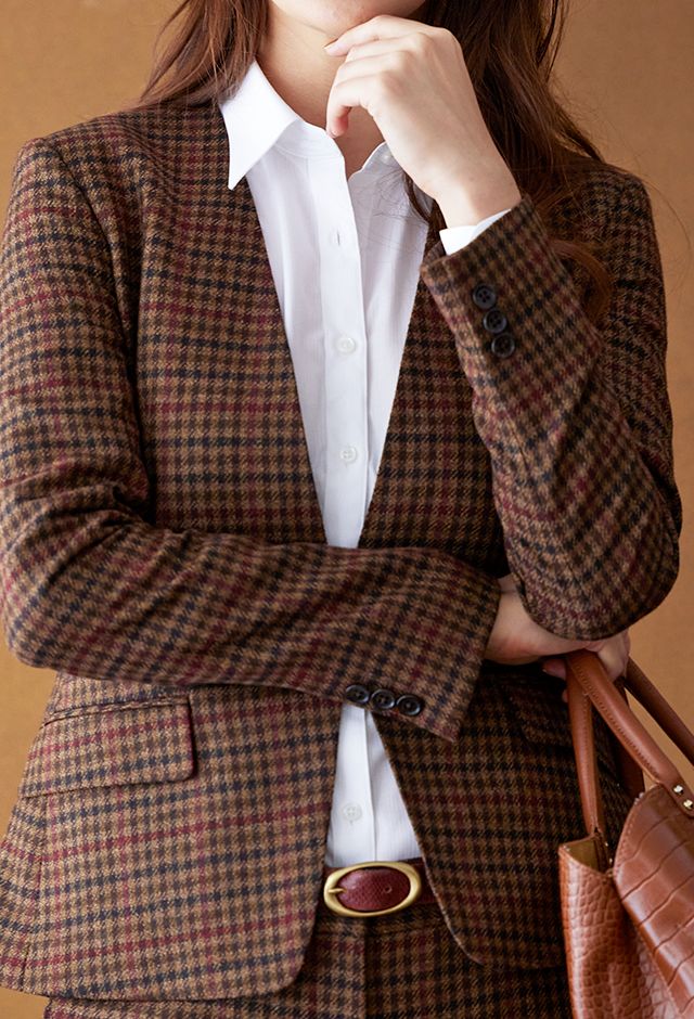 世界中のセレブリティから支持を得ているラグジュアリーブランド「ロロ・ピアーナ」で仕立てたスーツです。レッドやブラックのガンクラブチェックが入ったスタイルで、秋冬シーズンの生地になります。ジャケットはノーカラーモデル(ホック)、ボトムスは人気のテーパードパンツで仕立てました。スーツの色に合わせたダークブラウンのボタン、裏地にはブルーの花柄をセットに。全体的にブラウンで統一感を出し、ホワイトのシャツでガンクラブチェックの柄を際立たせたコーデに仕上げました。※生地在庫は変動いたしますのでご了承くださいませ。